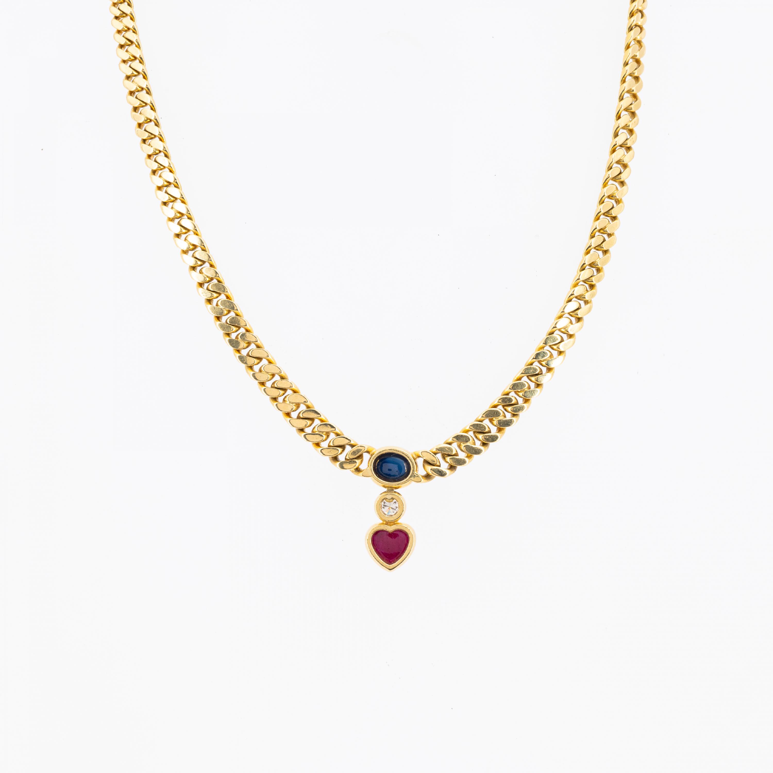 Edelsteine: 1 Saphir im Cabochon-Schliff ca. 1,8 ct., 1 Rubin im herzförmigen Cabochon-Schliff ca. 2,3 ct.