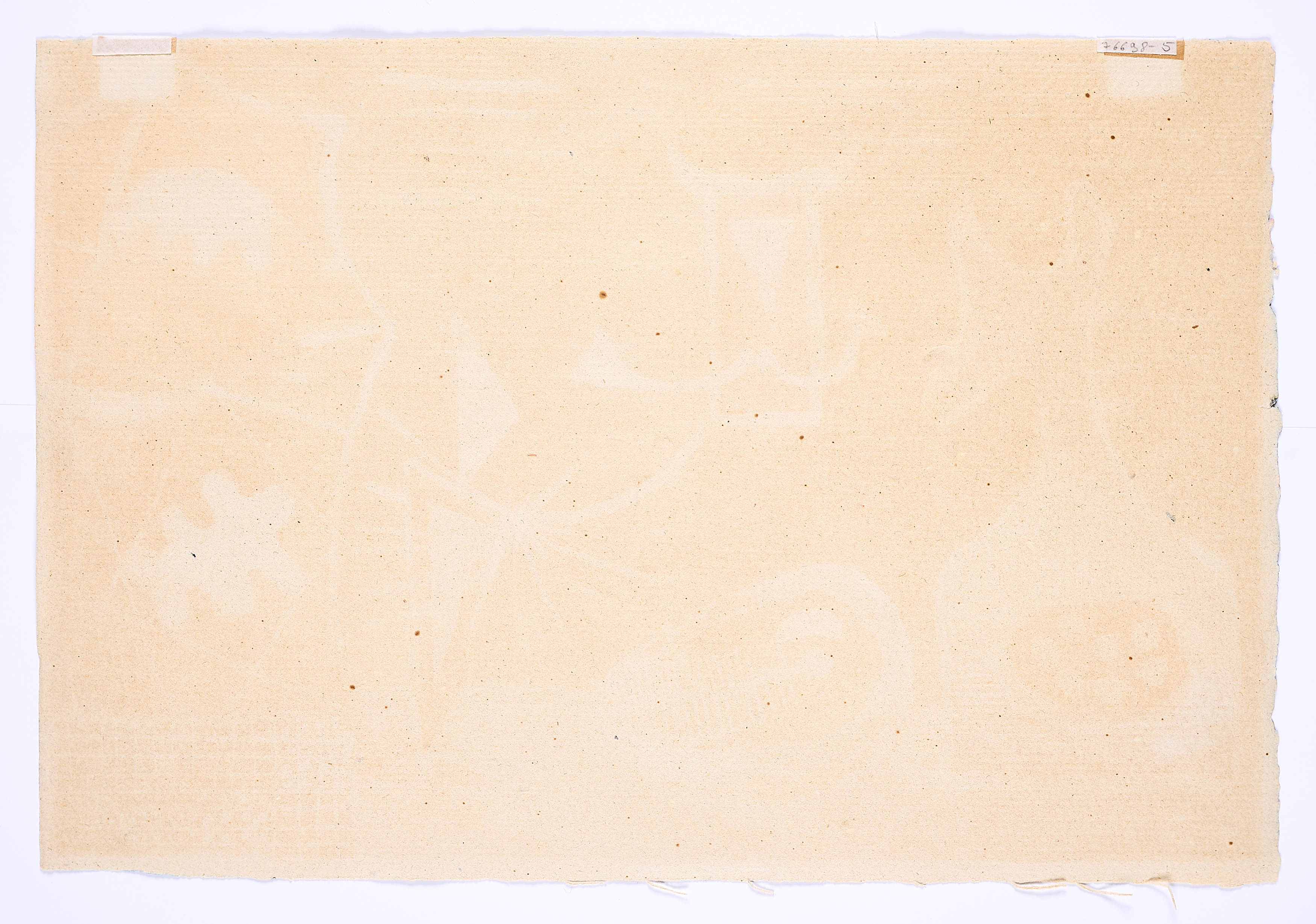 Herstellungsbedingt minimal gewellt. Verso Reste alter Montierung sowie leichtes Durchschlagen der Druckfarbe. Ansonsten guter Zustand.