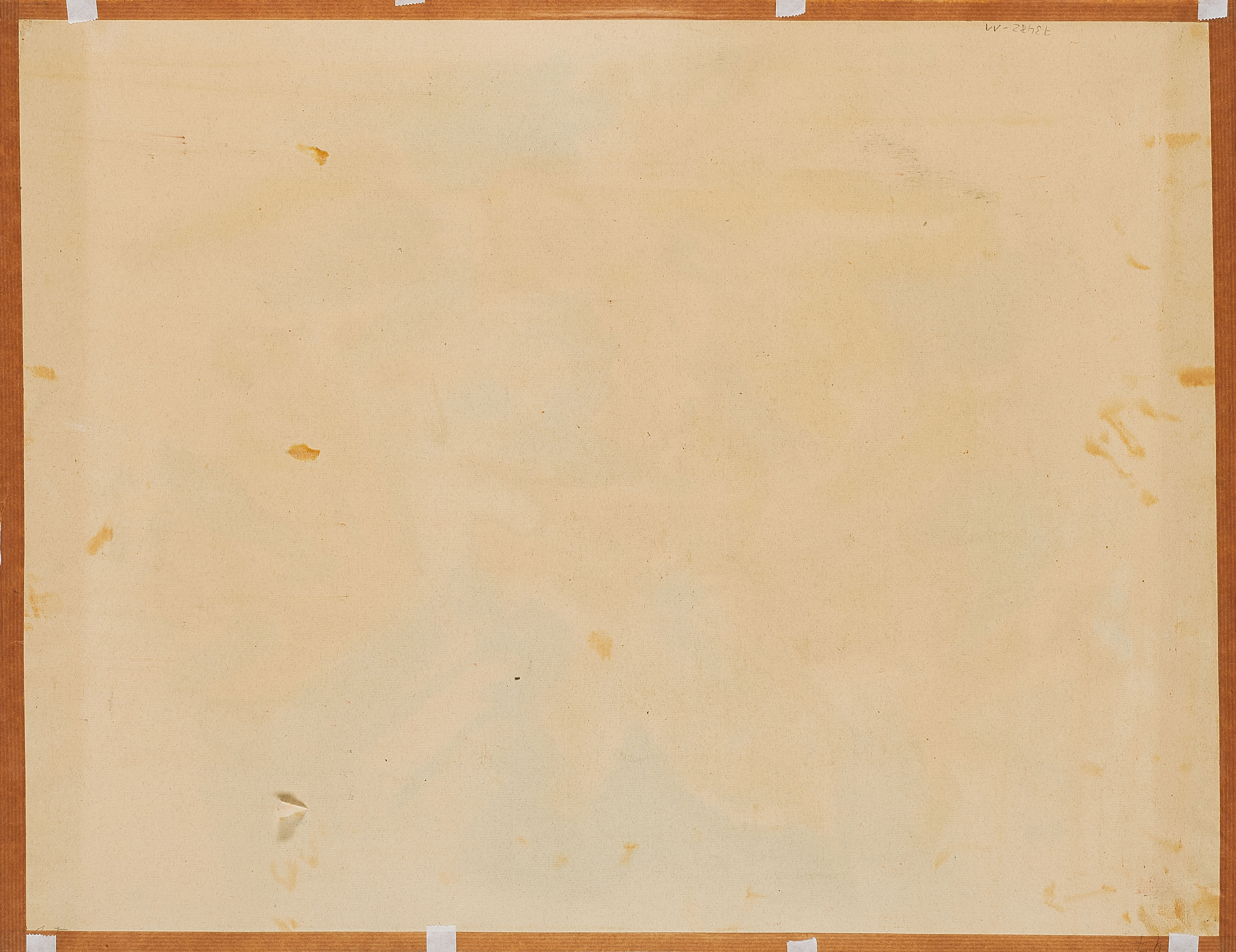 Minimale Griffspuren. Blatt leicht und unregelmäßig gebräunt. Stecknadellöcher in den Ecken. Verso Reste alter Montierung sowie Arbeitsspuren. Ansonsten guter Zustand.