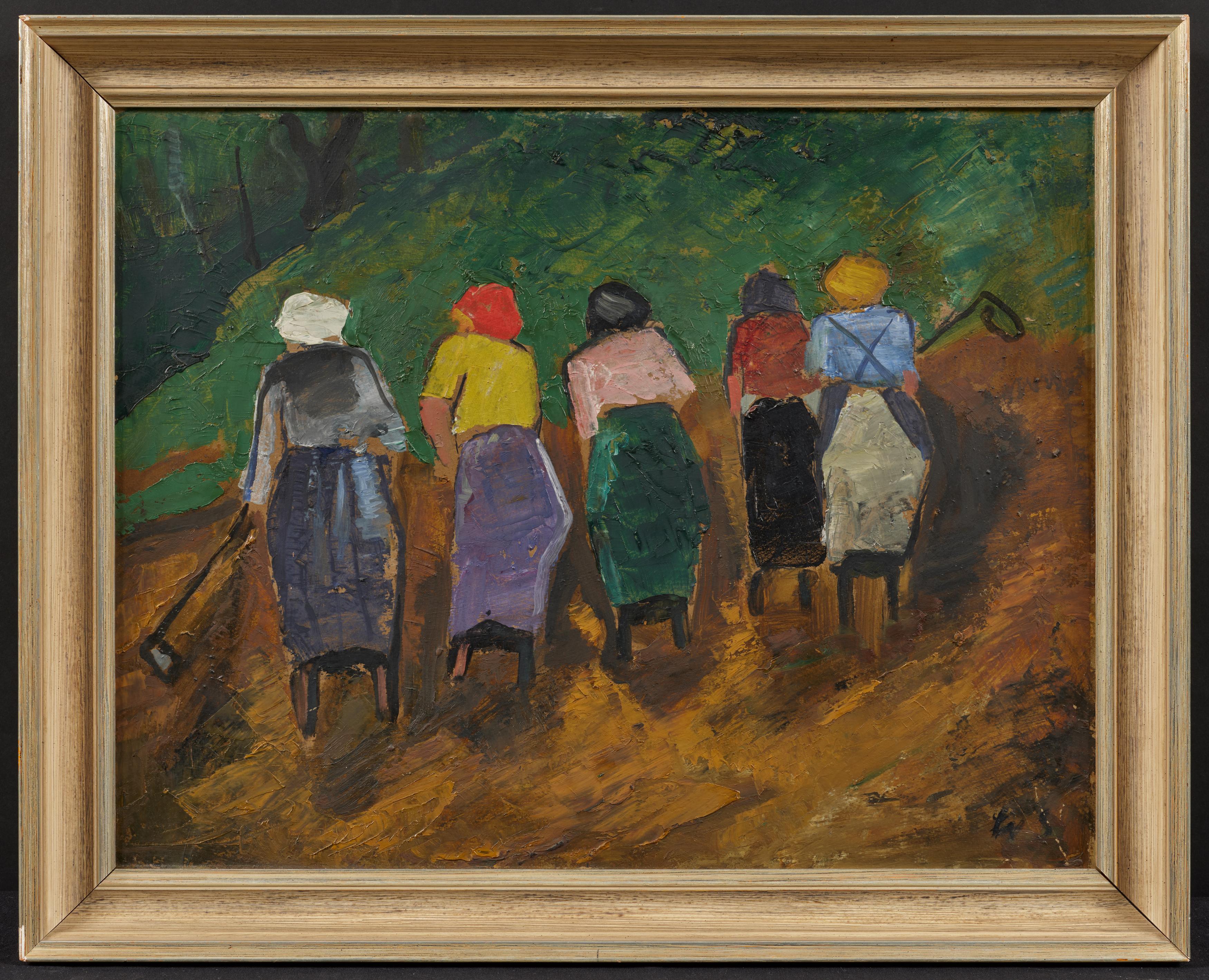 Leicht gewellt. Leichte Bereibungen entlang der linken Kante, der Oberkante und im unteren rechten Eckbereich. Unter UV-Licht keine Retuschen oder Übermalungen erkennbar. Ansonsten guter Zustand. Im Rahmen beschrieben.