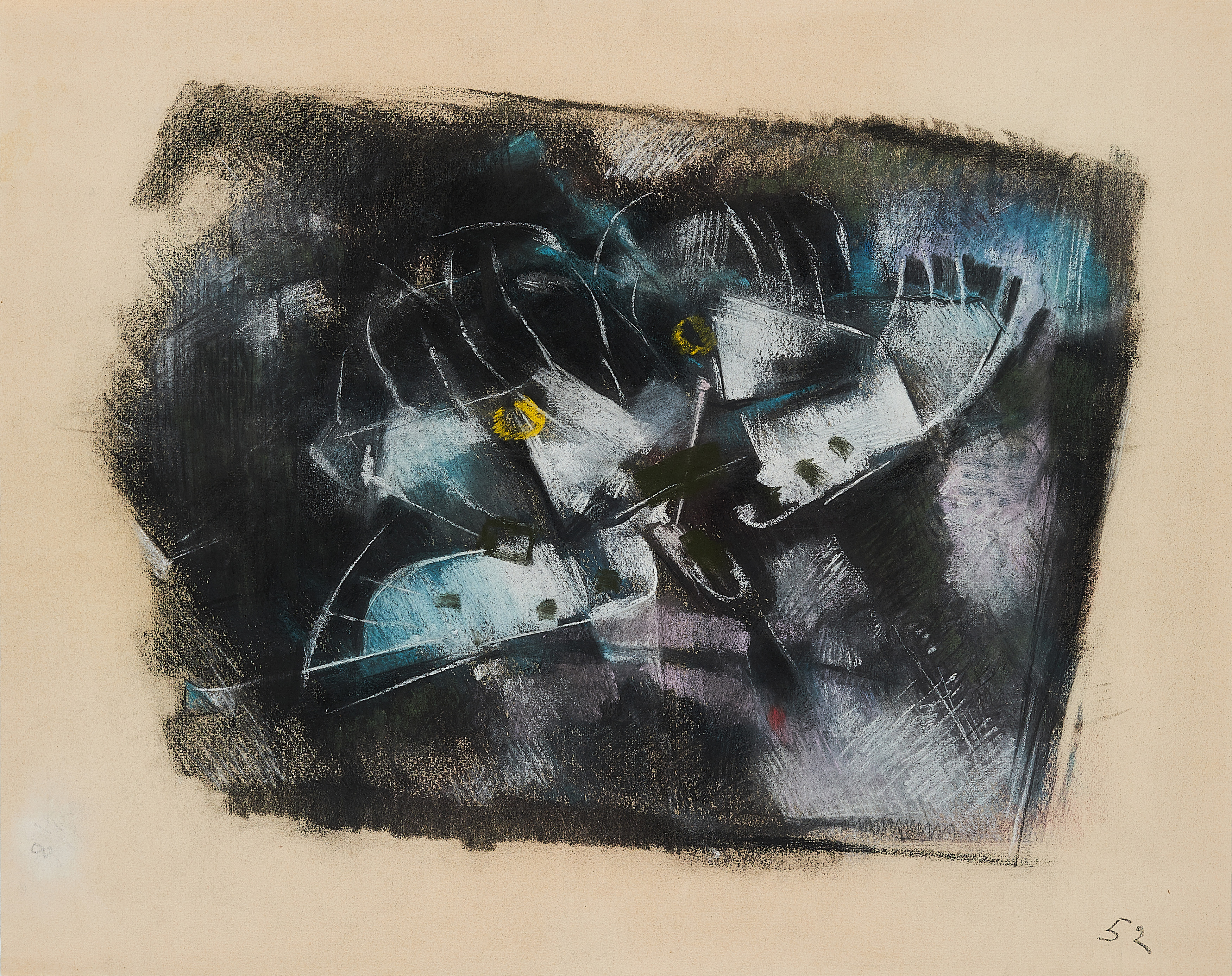 Pastellauftrag minimal berieben, dadurch bedingte leichte Verschmutzungen des Bildträgers. Minimale Griffspuren.
