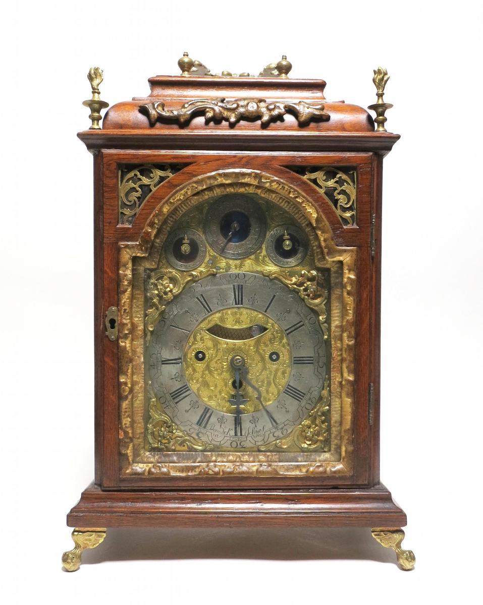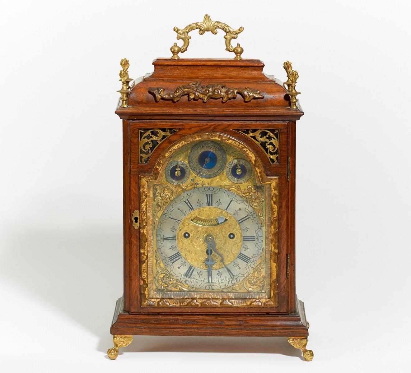 Technik: Eichengehäuse. Vergoldete und tlw. gravierte Applikationen. Versilberter Ziffernkranz.