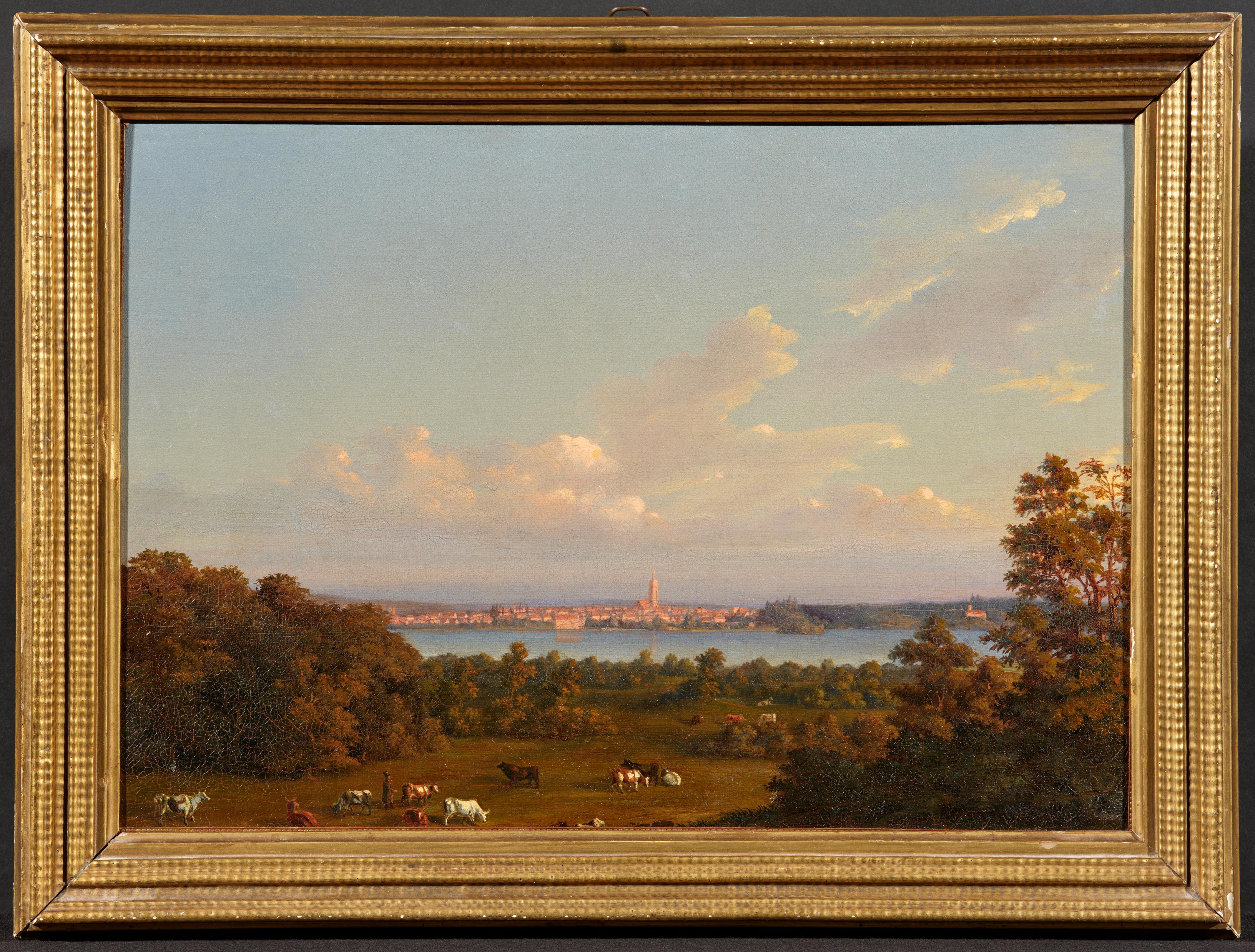 Titel: Blick von der Kuhbrücke bei Neustrelitz über den Zierker See auf Stadt und Stadtkirche.