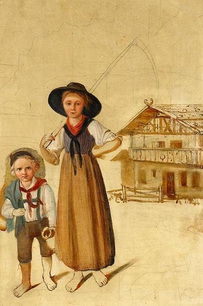 Studie mit zwei Kindern vor einem Hof. Öl auf Leinwand. Auf Karton montiert. 30,5 x 20,5cm. Rahmen.