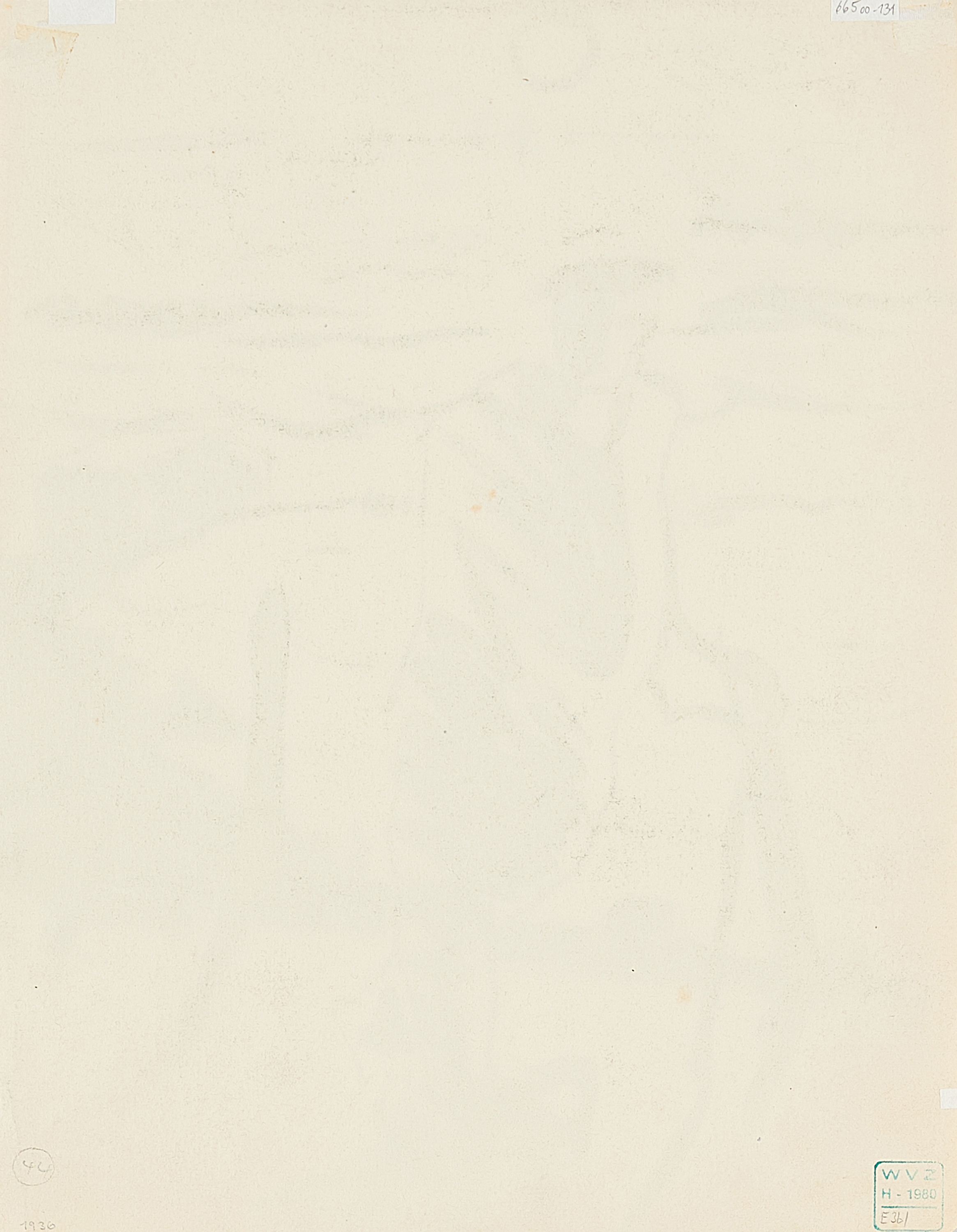 Blatt in den Randbereichen leicht unfrisch. Minimale Knickspuren in den Ecken. Punktuelle bräunliche Verschmutzung im Zentrum. Minimaler rückseitig hinterlegter Papiereinriss (ca. 0,5cm) an der linken Kante unten. Verso Reste alter Montierung in den oberen beiden Ecken.