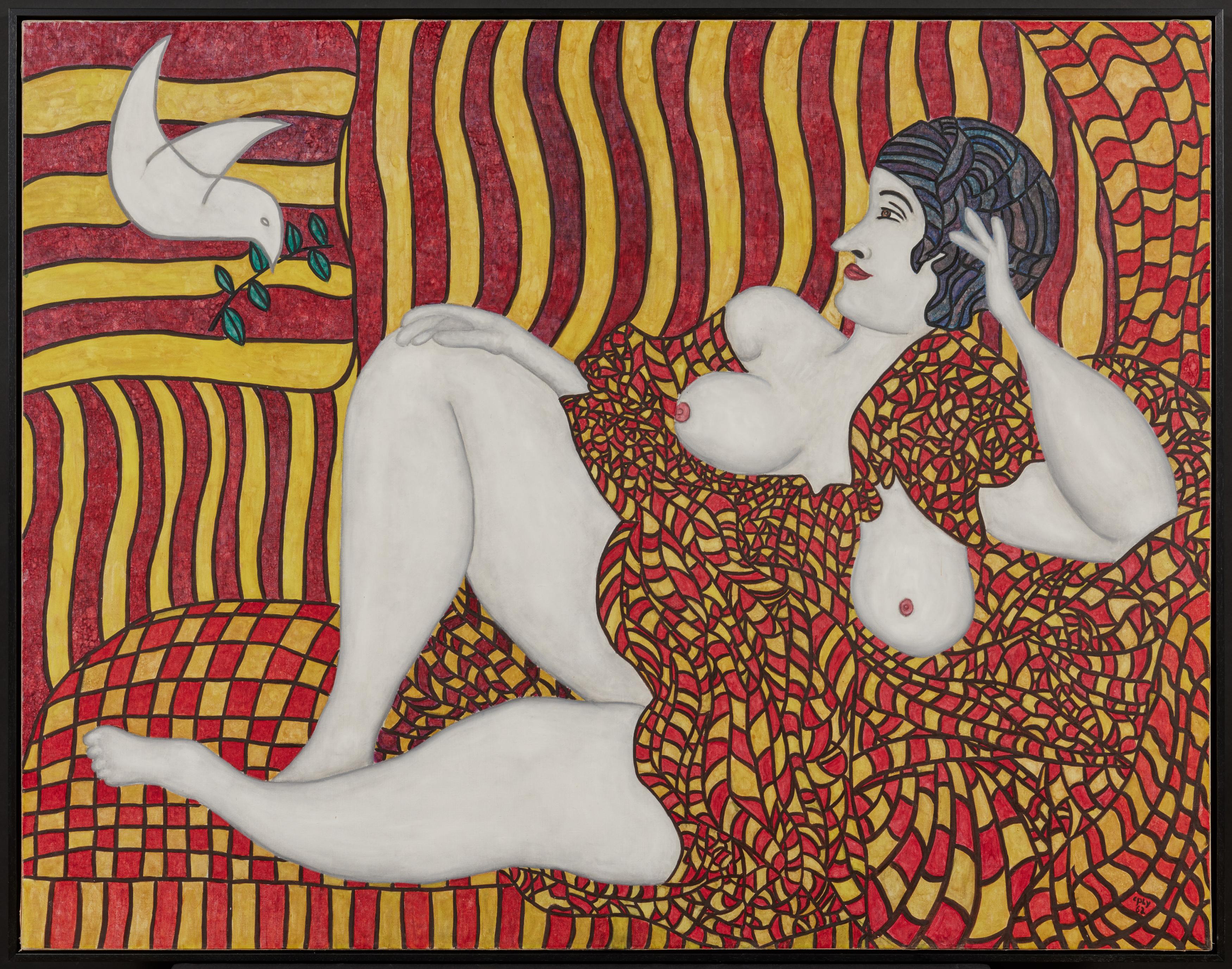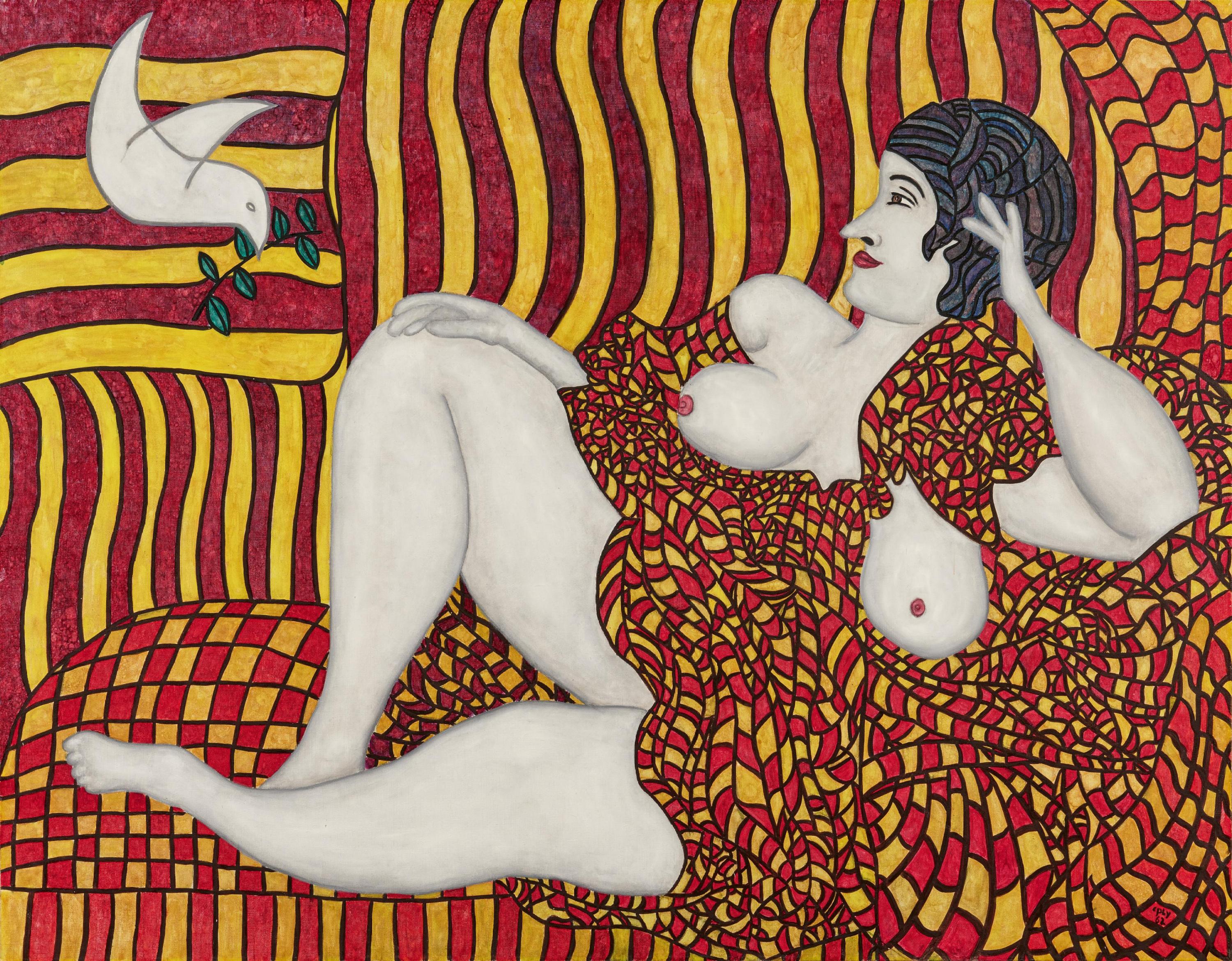 Mit diesem wichtigen Bild brachte Copley seinen ironischen, erotisch gefärbten Humanismus mit einer lasziven Frauenfigur auf den Punkt, deren Hintergrund mit seinen starkfarbigen Streifen das "Star Spangled Banner" karikiert, während die offenherzige Dame die Freizügigkeit einer Malerei zelebriert, die in der französischen Tradition des 19. Jahrhunderts wurzelt. Copleys Dame ist ein Amalgam der unbekleideten Dame aus Manets "Dejeuner sur l'herbe" und seiner "Olympia", zwei der umstrittensten Gemälde im Paris der 1860er Jahre, die gut 100 Jahre später zum festen Bestandteil der Französischen Kulturfolklore geworden waren. Die Friedenstaube in der linken oberen Ecke von Copleys Bild ist als Mahnung gegen den Kalten Krieg zu verstehen, der in diesem Jahr in eine neue Phase trat, die im Oktober 1962 in der Schweinebucht-Krise auf Kuba gipfelte.