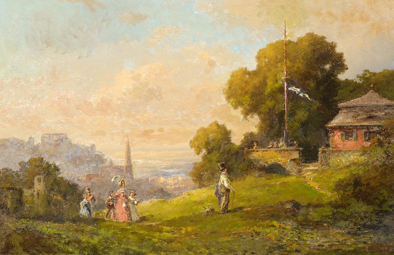 Festliche Gesellschaft vor der Marburger (?) Stadtkulisse. Signiert unten links: Willy Moralt. Öl auf Holz. 36 x 55cm. Rahmen.