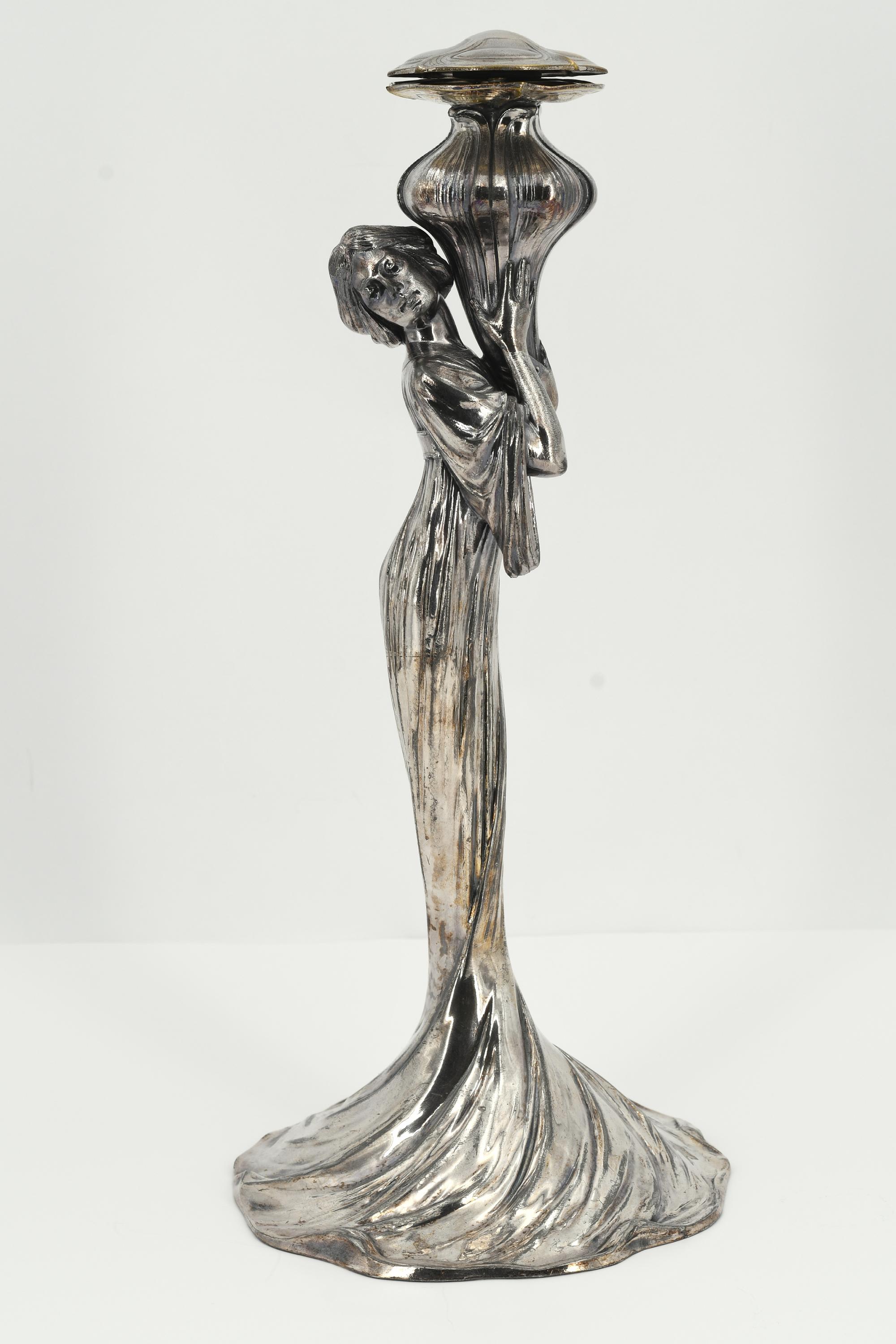 Beschreibung: Der Schaft der Schale in Form einer jungen Frau mit langem, eng anliegendem Kleid