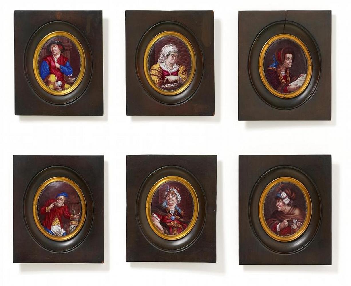 FOLGE VON SECHS EMAILPLAKETTEN MIT GENREPORTRAITS.