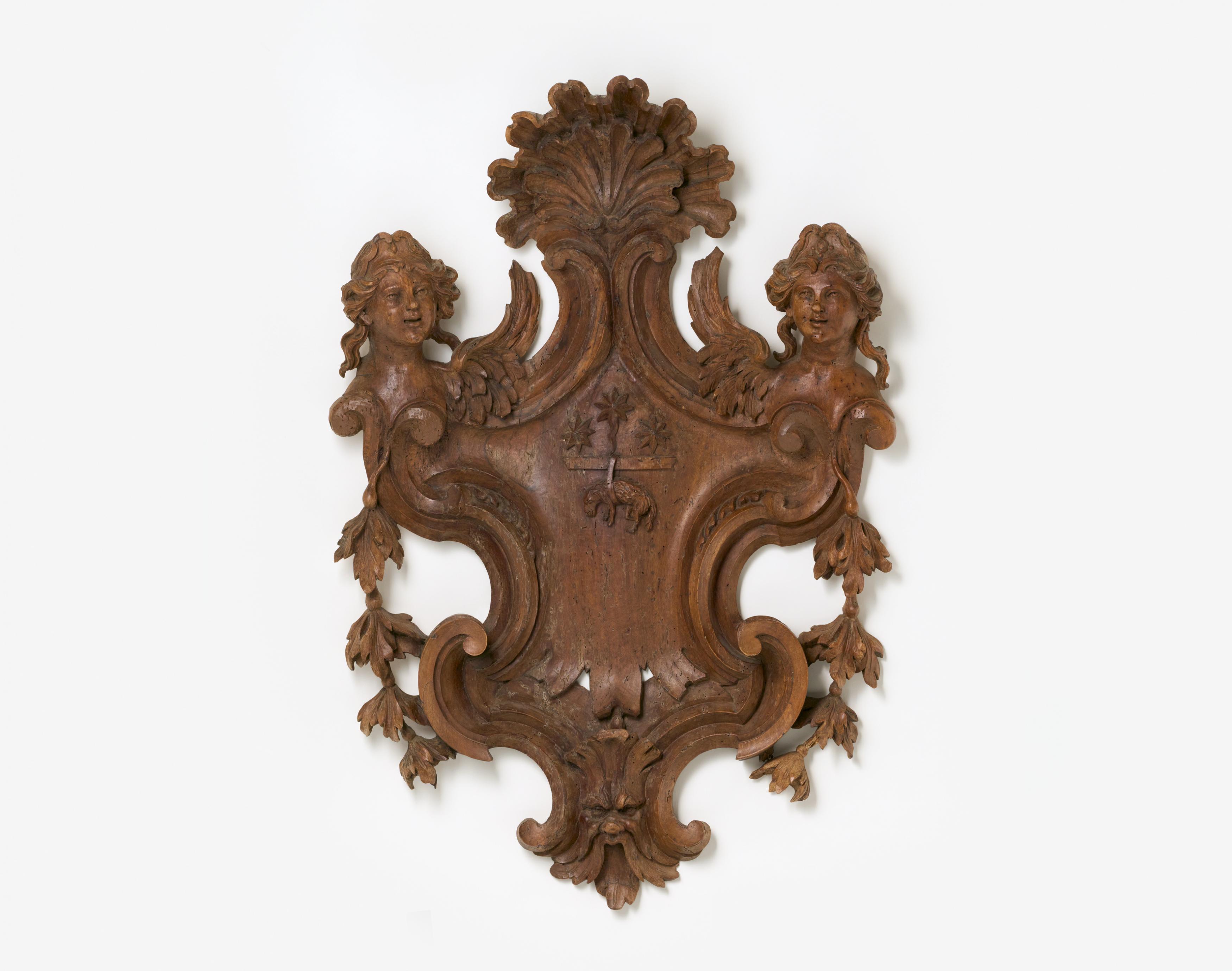 Beschreibung: Volutenförmiges Schild mit großer bekrönender Muschel. Im Schild drei Sterne und ein Hund