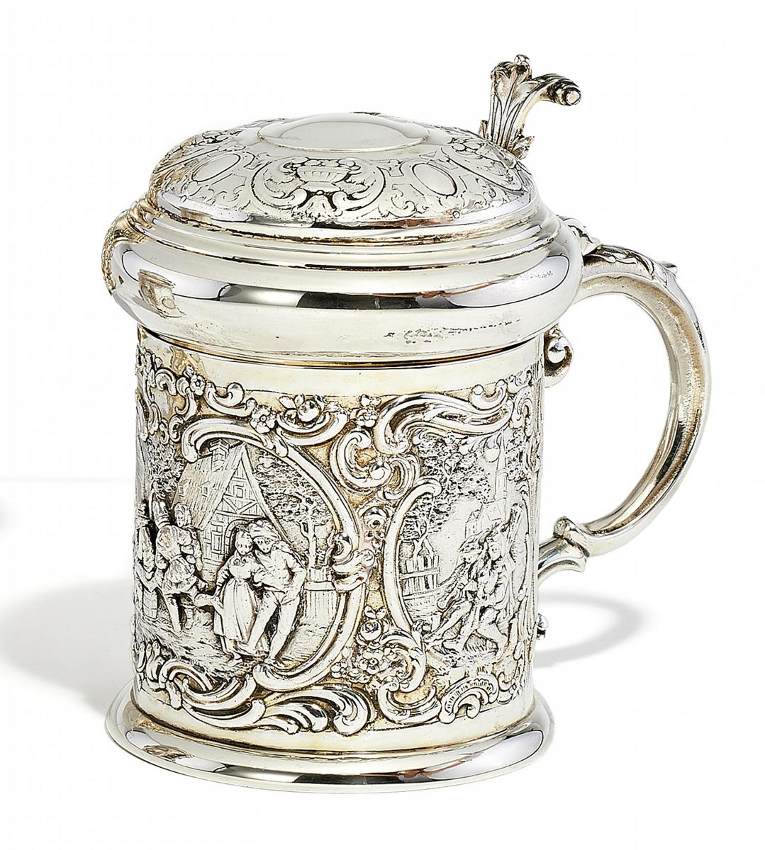 Silber mit Innenvergoldung. Auf zylindrischer Wandung drei Rocaillekartuschen, darin tanzende und feiernde