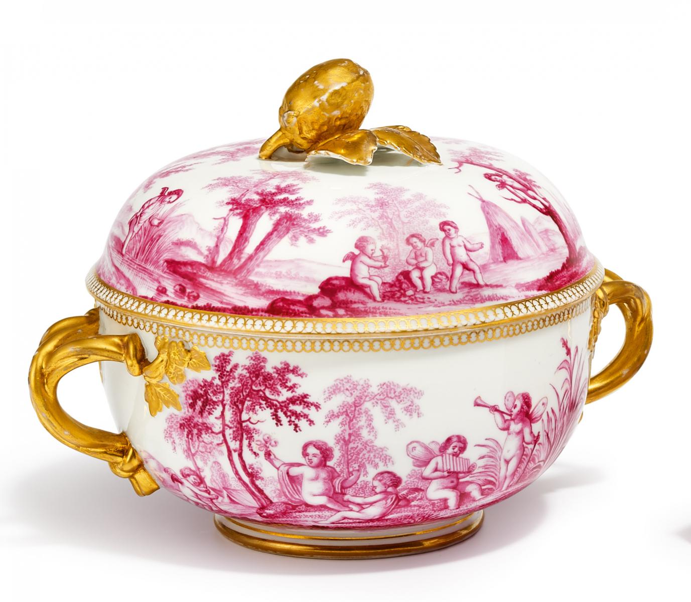 Porzellan, Dekor in Purpurcamaieu und Gold. Allseitig feine Waldlandschaft mit Amorettengruppen. Höhe 12,5 cm, Breite 17 cm.
