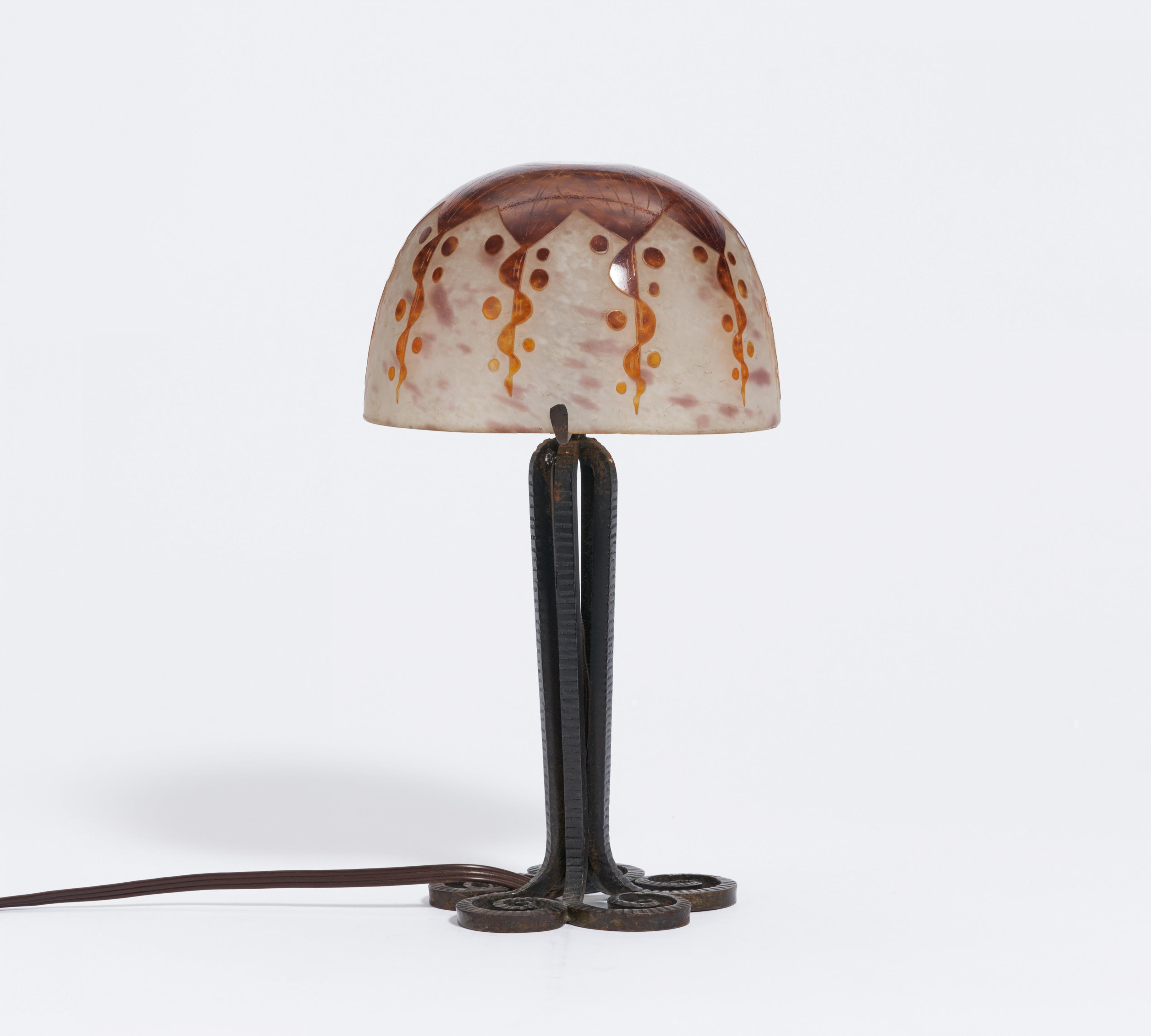 Material: Farbloses Glas, milchig weiße und violette Pulvereinschmelzungen. Überfang in Orangebraun.