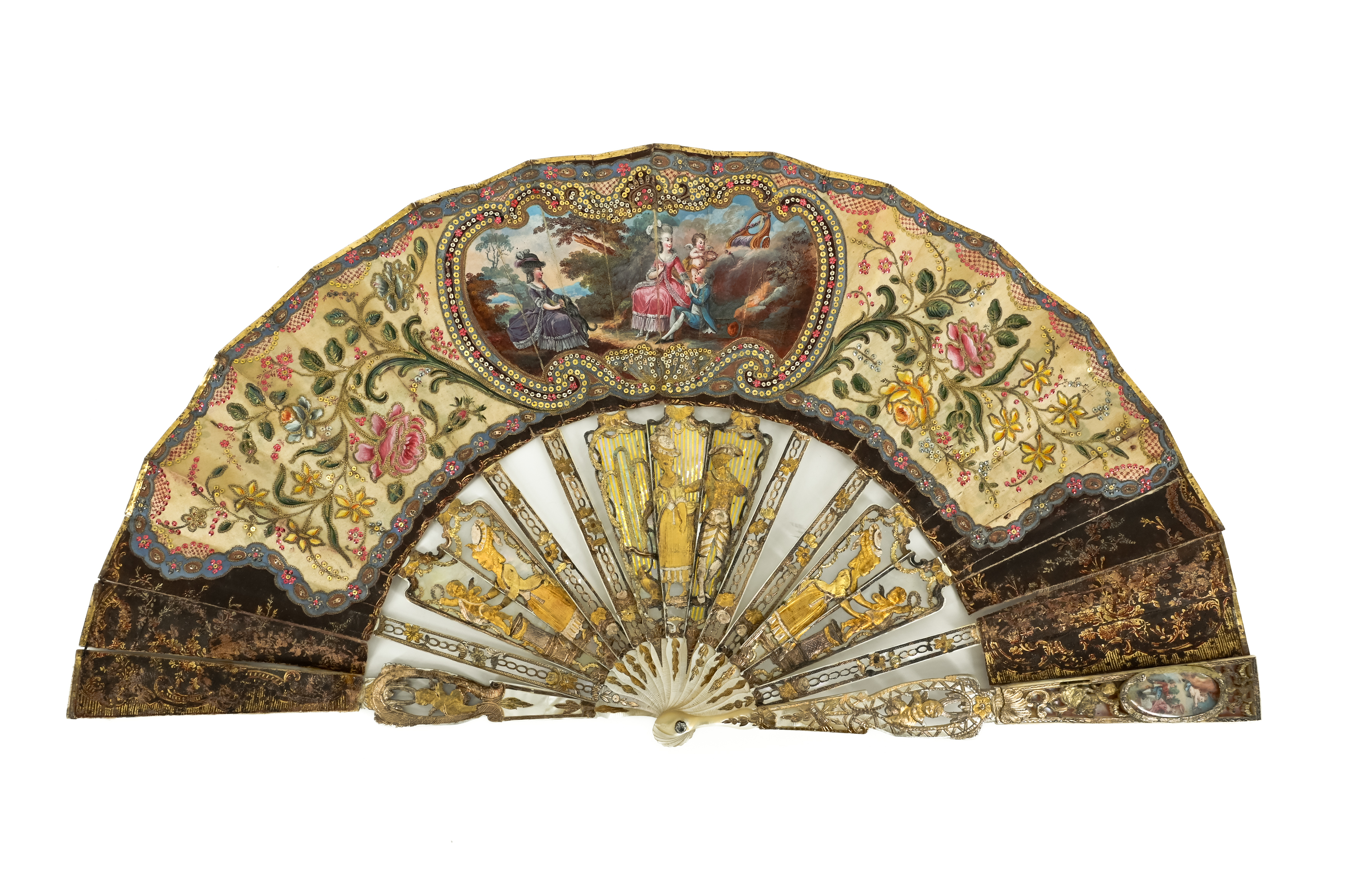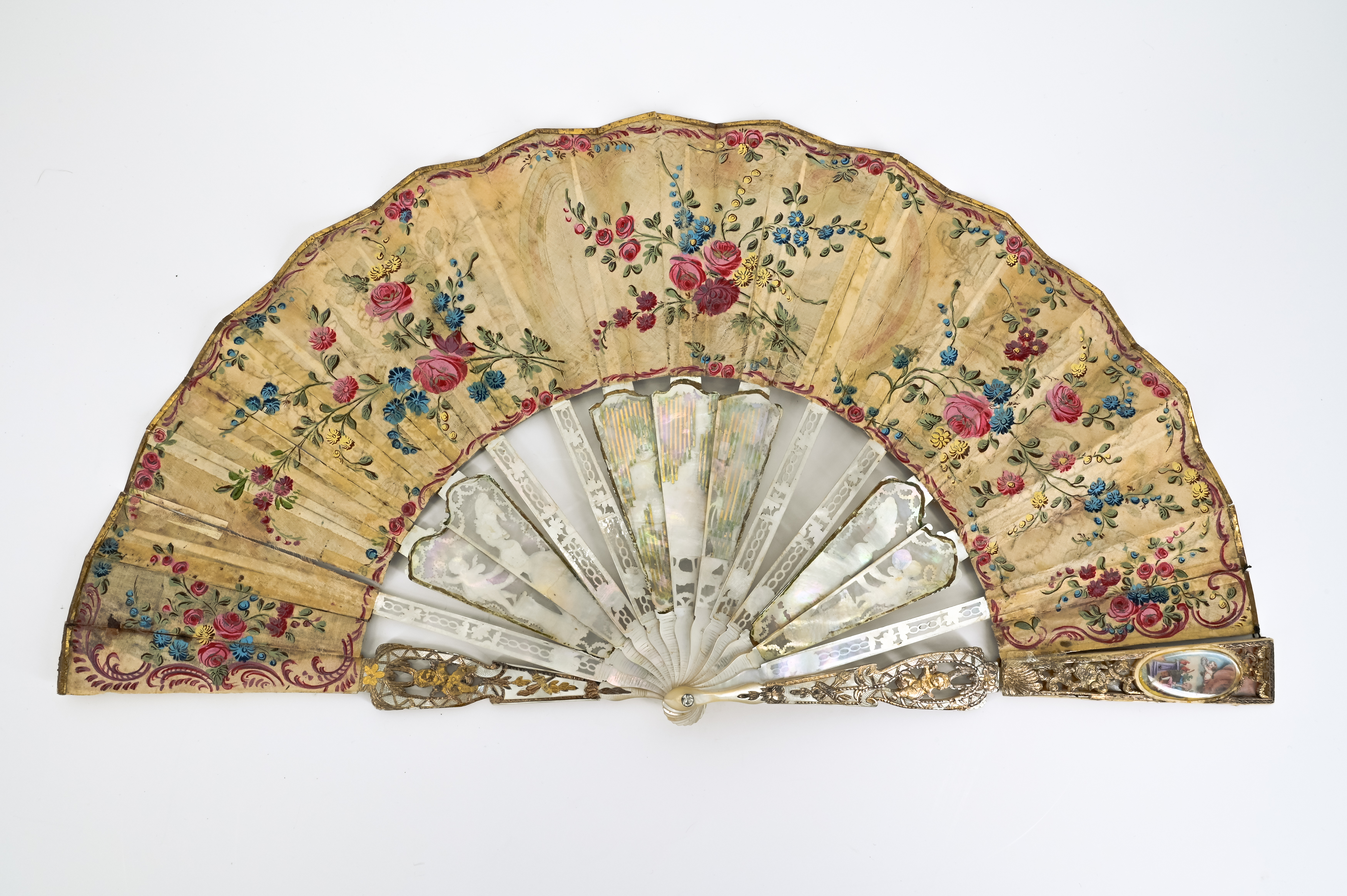FÄCHER MIT GALANTEM PAAR UND FLORALEM DEKOR.