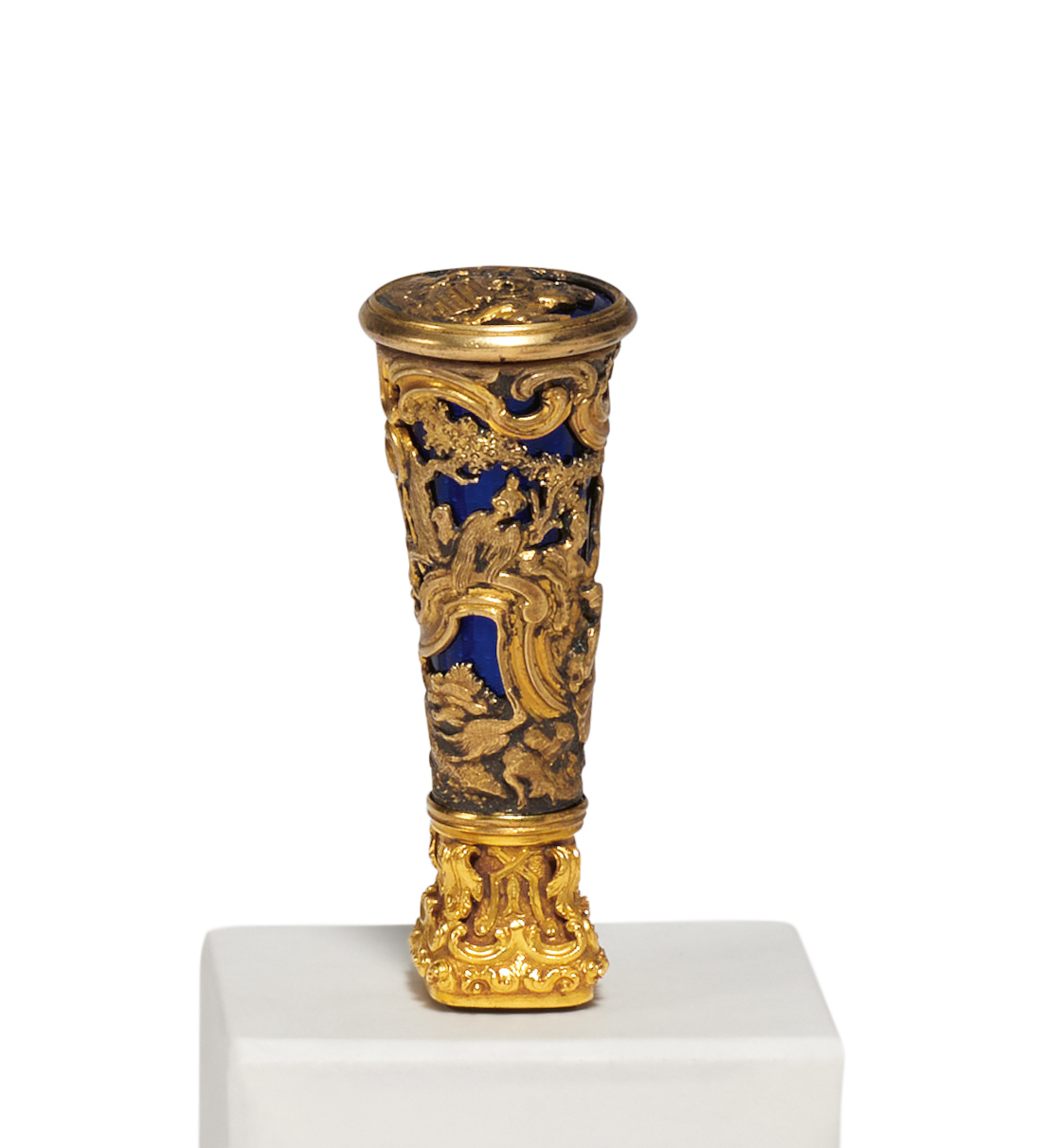 Beschreibung: Konische Form. Das durchbrochene Relief mit Rokokopaar in Park vor dunkelblauem Grund. Das