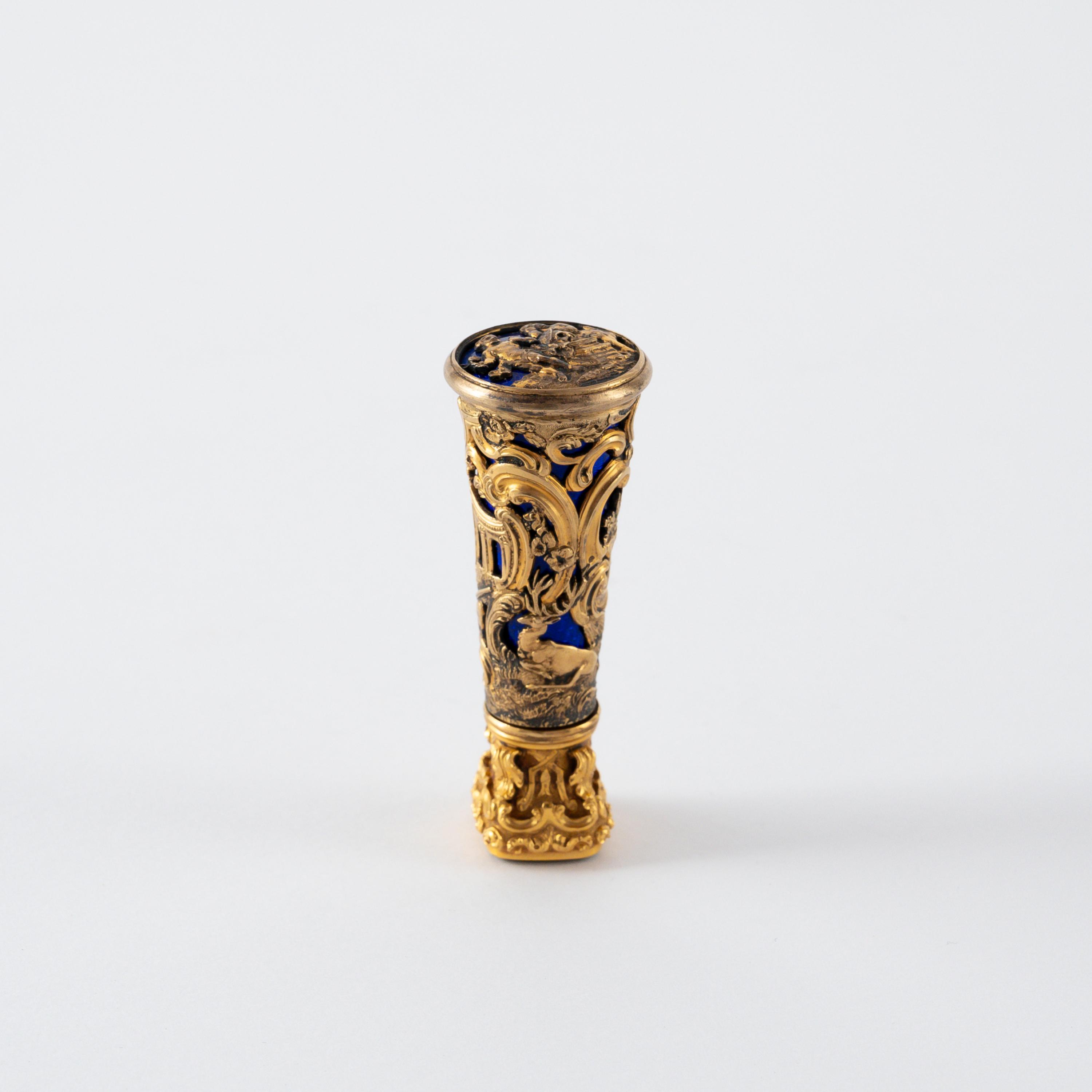 Technik: Silber vergoldet, Gelbgold (getestet), dunkelblaues, transluzides Email.