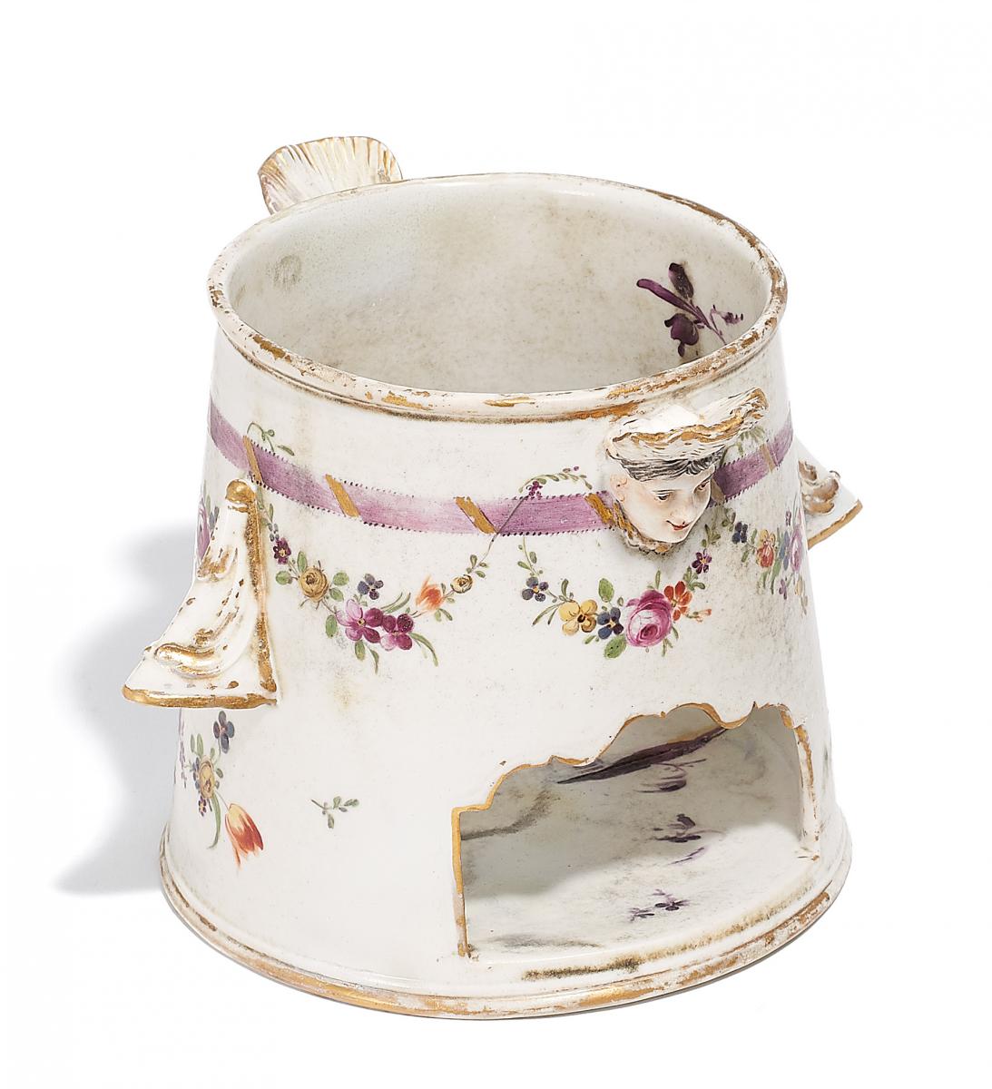 Porzellan, farbig und gold dekoriert. Auf der Schauseite unterhalb eines weiblichen Maskarons Wappen mit Stier unter