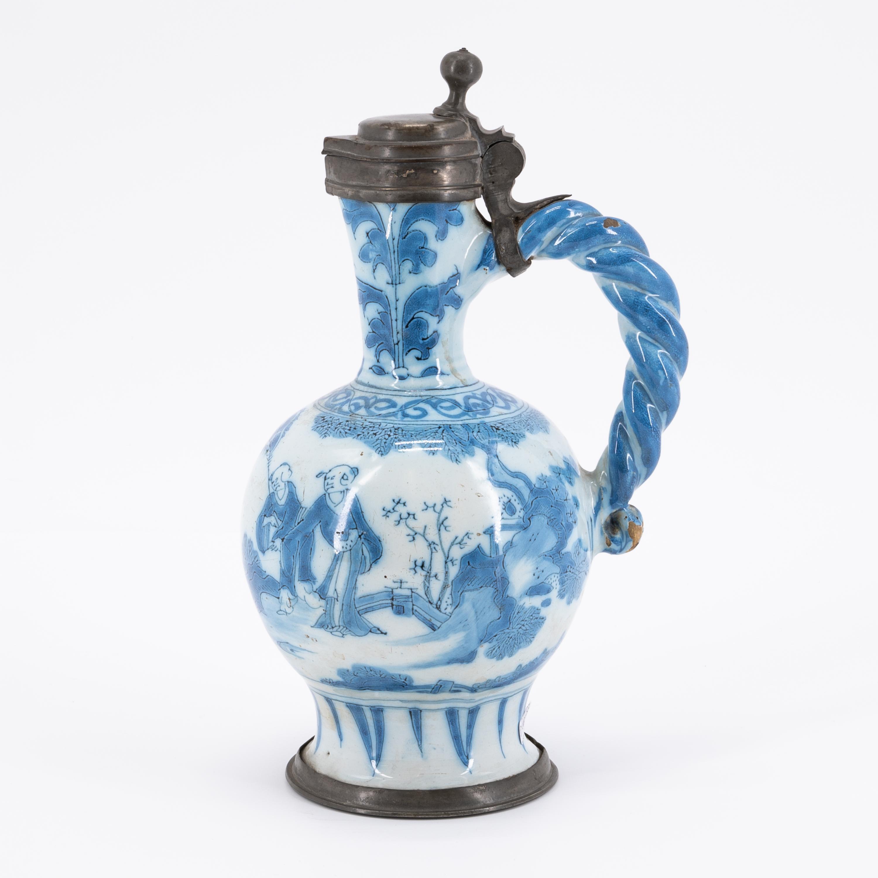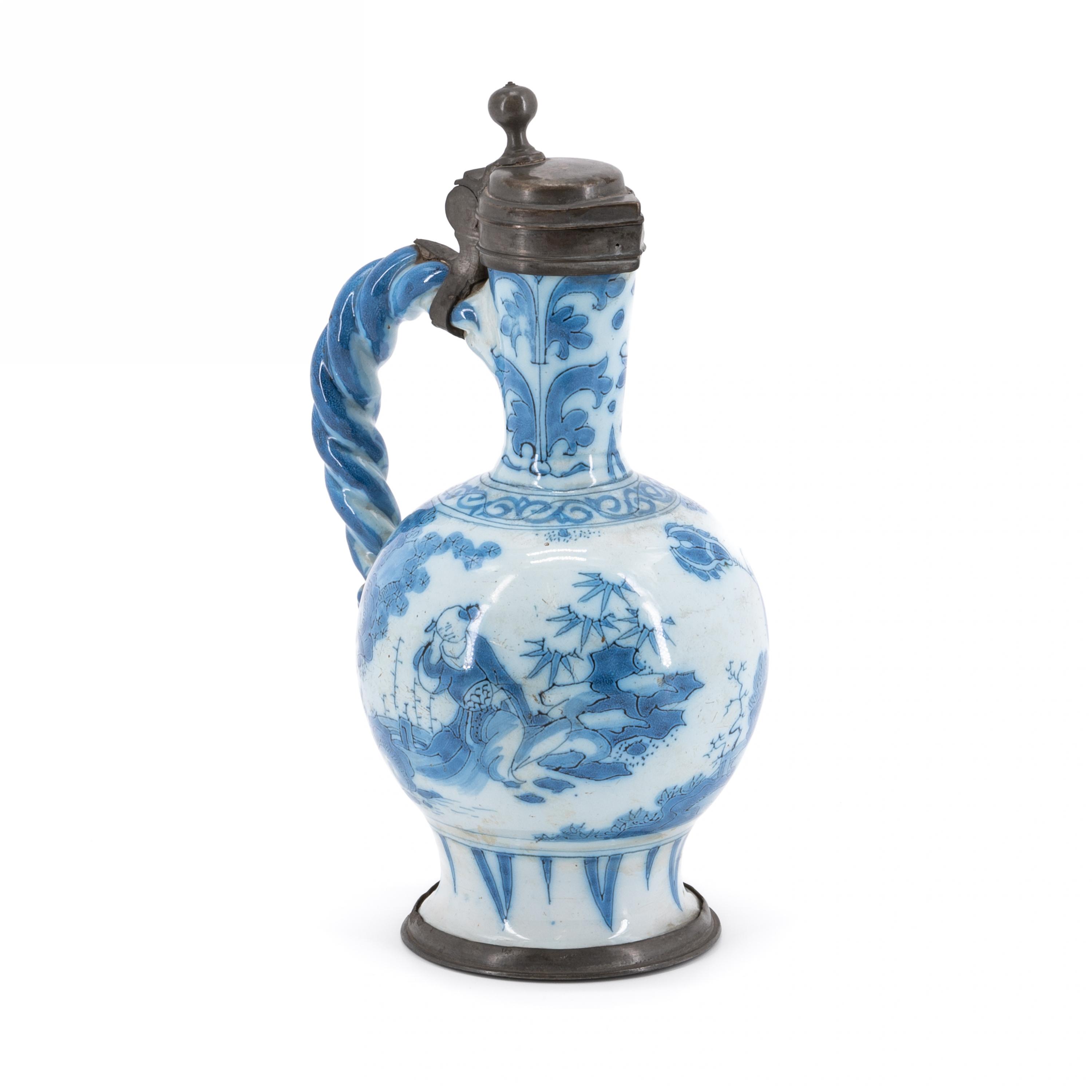 Technik: Sandfarbener Scherben mit lichtblauer Glasur und dunkelblauem Dekor. Zinnmontierung.