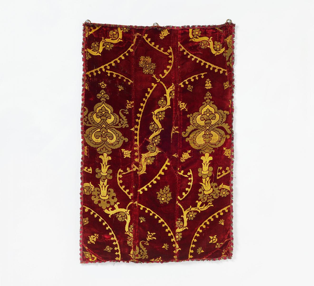 ROTER SEIDENSAMT MIT GOLDFÄDEN.