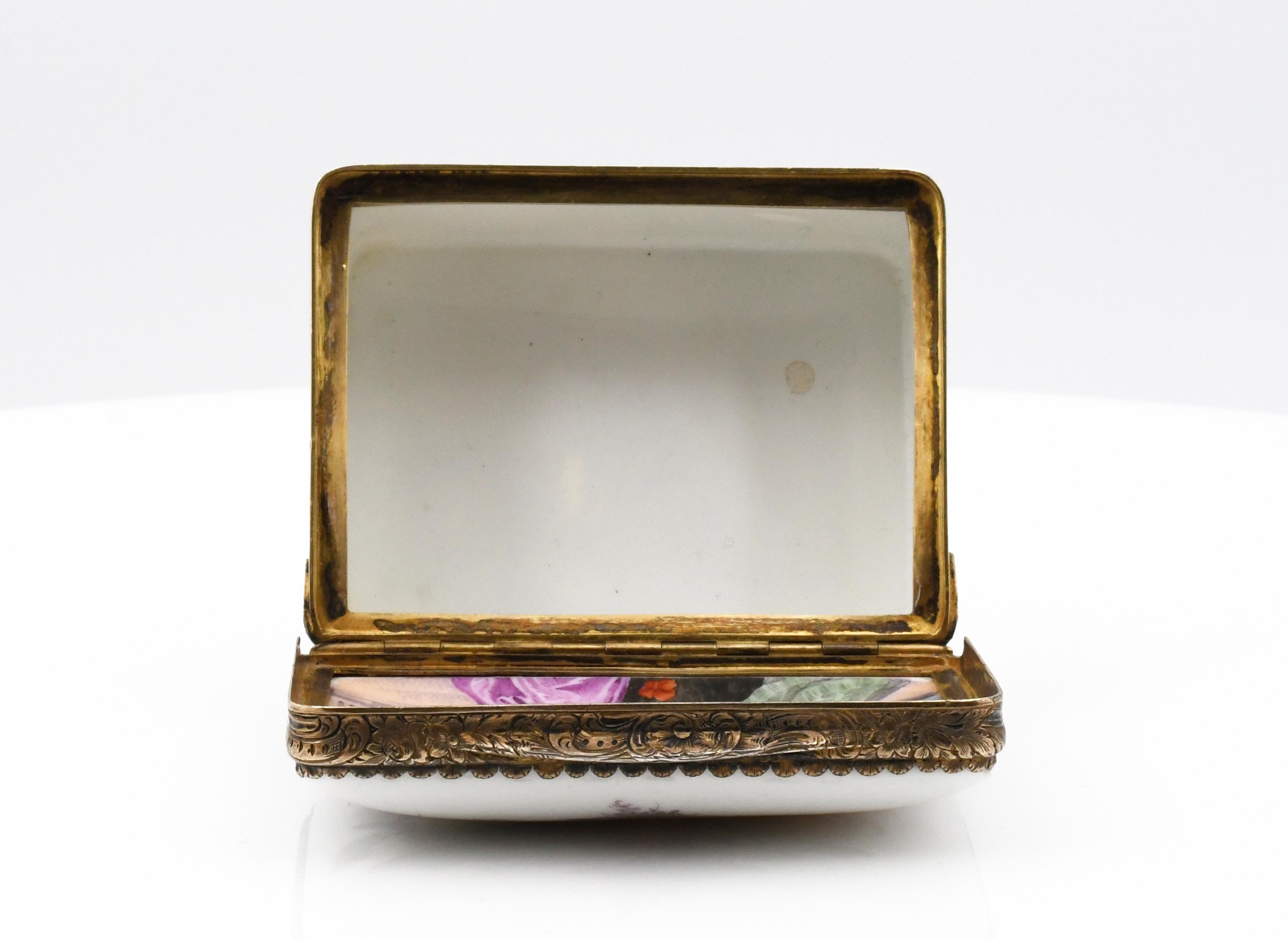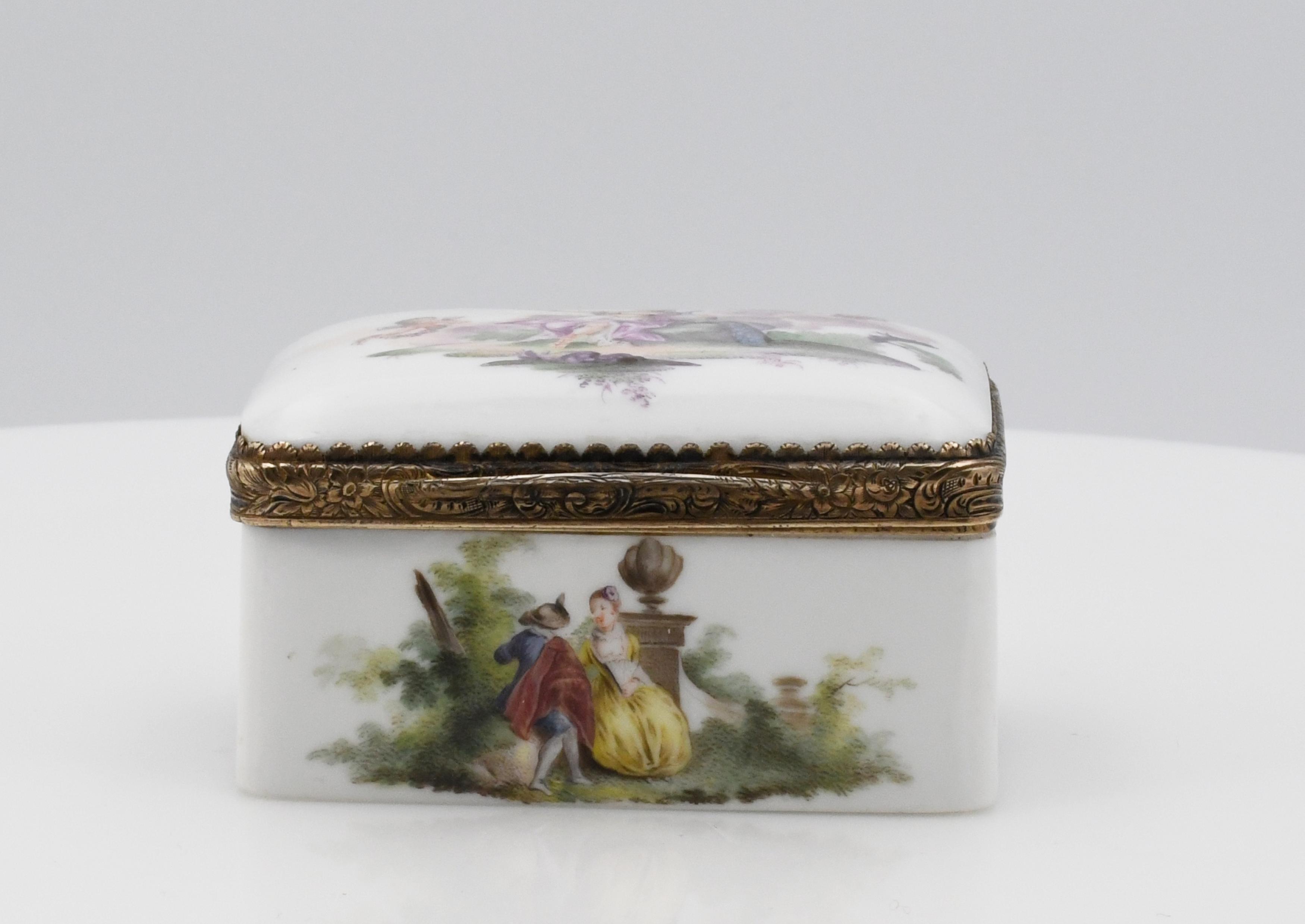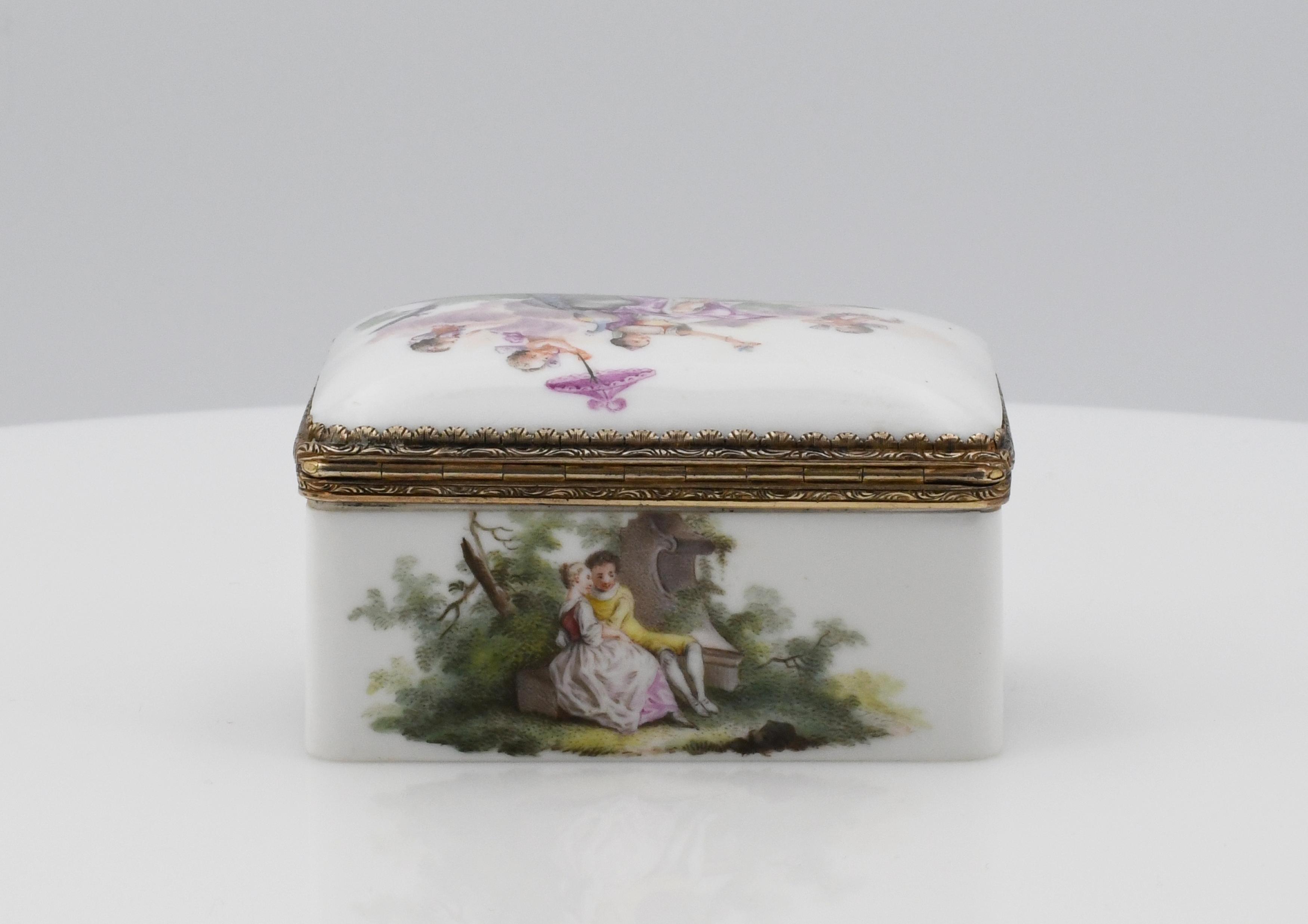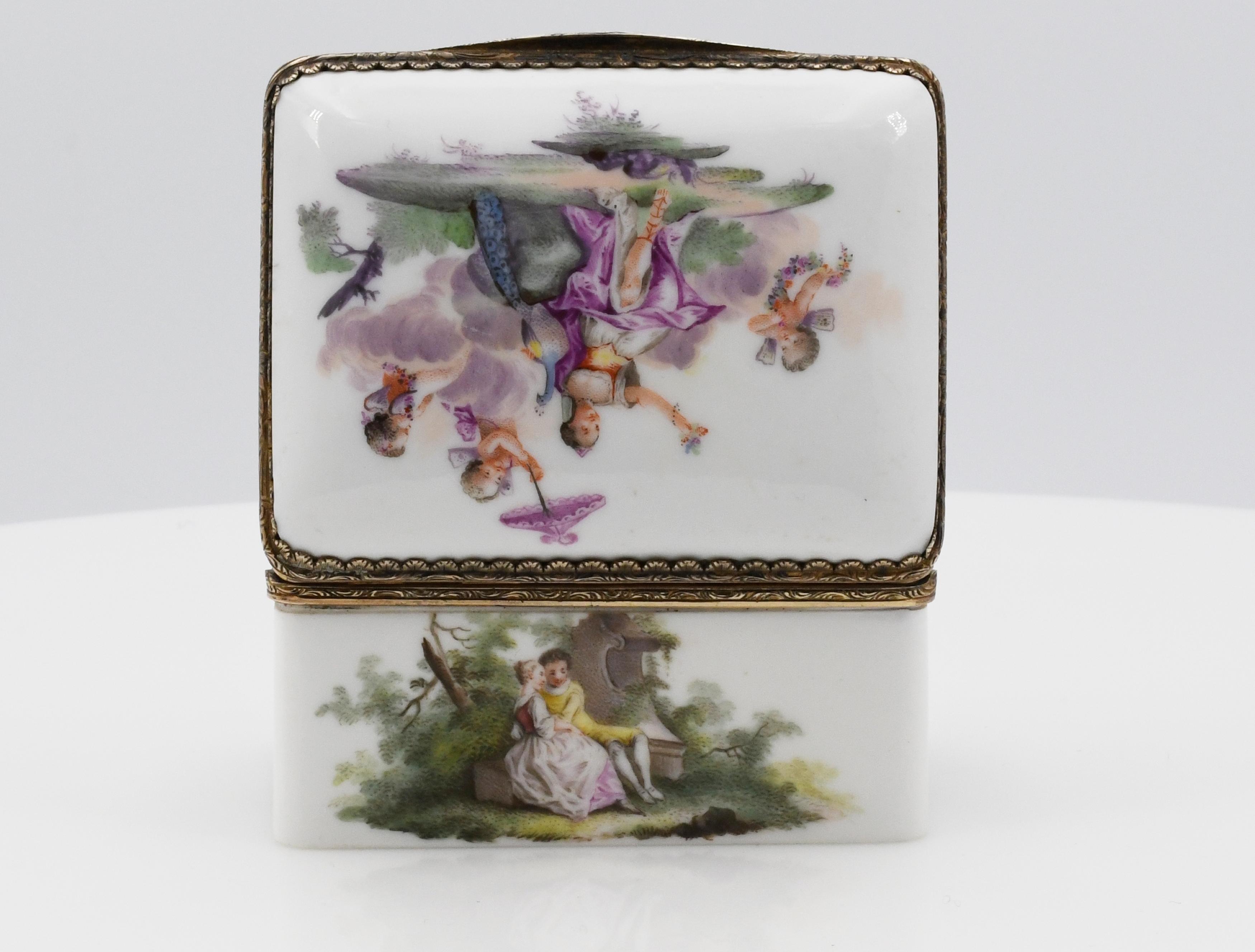 Technik: Porzellan, farbig dekoriert. Vergoldete Silbermontierung.