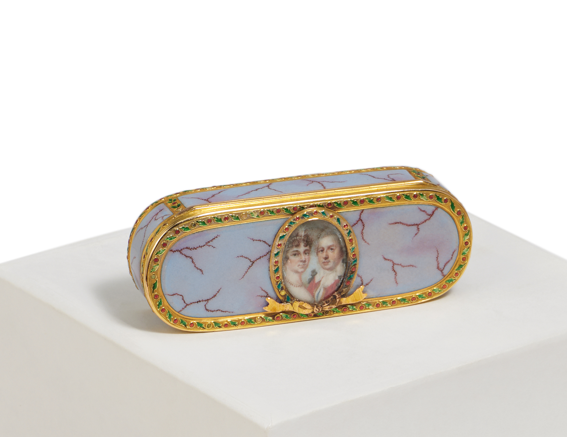 dem Deckel ovales Medaillon mit Glasabdeckung. Darunter Doppelporträt eines Paares.