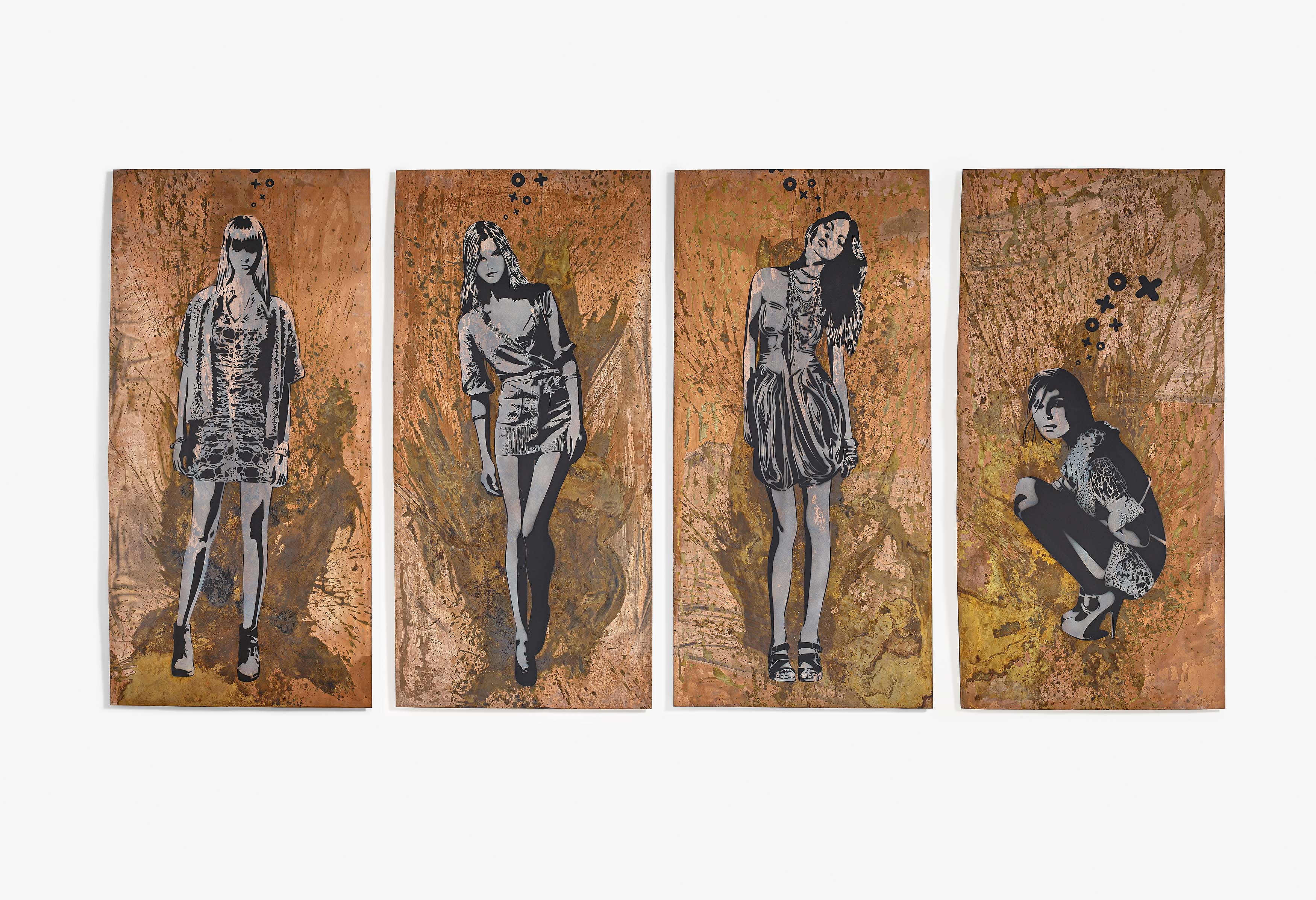 Technik: Jeweils: Stencil auf Kupferplatten, partiell oxidiert. Auf Holz montiert.