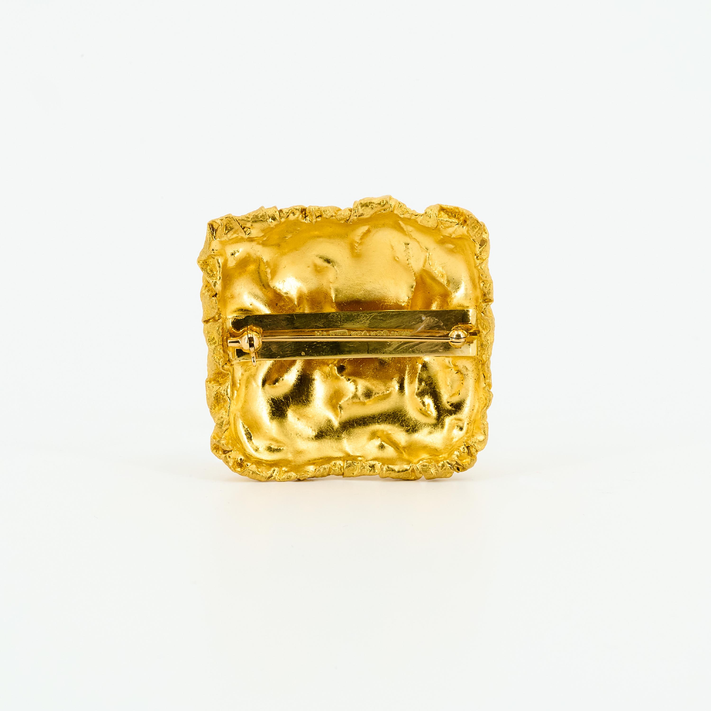 Beschreibung: Signiert "YH", Künstlerpunze in japanischen Schriftzeichen. Dreidimensionale, quadratische Brosche aus sanft zerknitterter Goldfolie. Eine künstlerische Arbeit in reduzierter, klarer Formensprache mit lebhafter Textur. Original Box anbei.