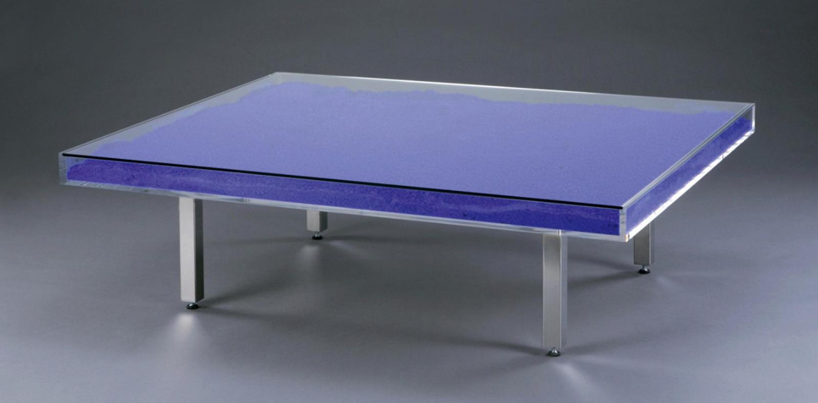 Blue Table. 1963. International Klein Blue Pigment, Glas, Plexiglas und Stahl36 x 125 x 100cm. Bezeichnet, nummeriert und signiert auf einem Etikett auf der Unterseite: This table conforms to Yves Klein's patent. Serial number: UR-RESS. R. Klein-Moquay.