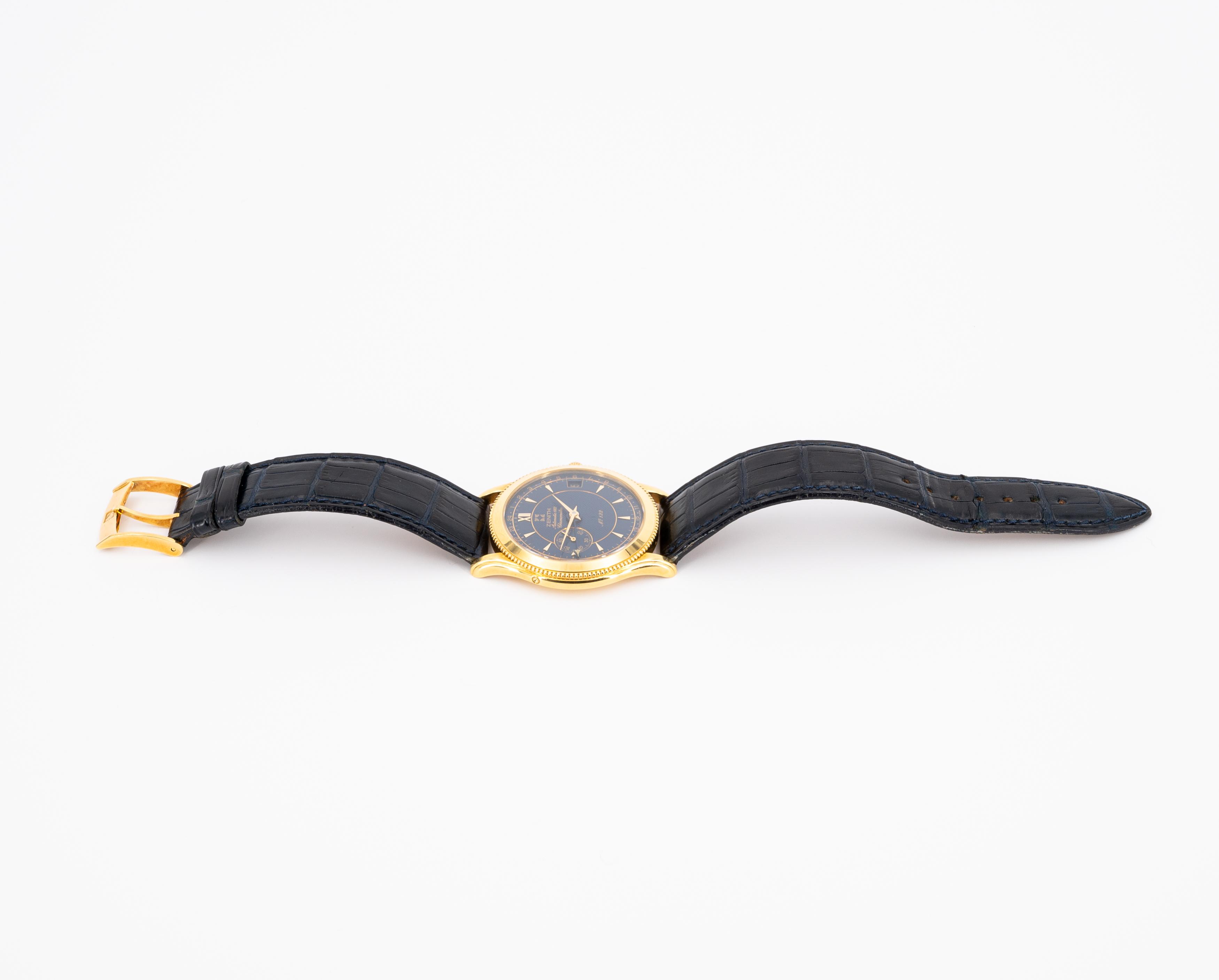 Gehäuse/Armband: 750/- Gelbgold, Lederarmband mit Dornschließe, Zffbl. blau, Zeiger golden.