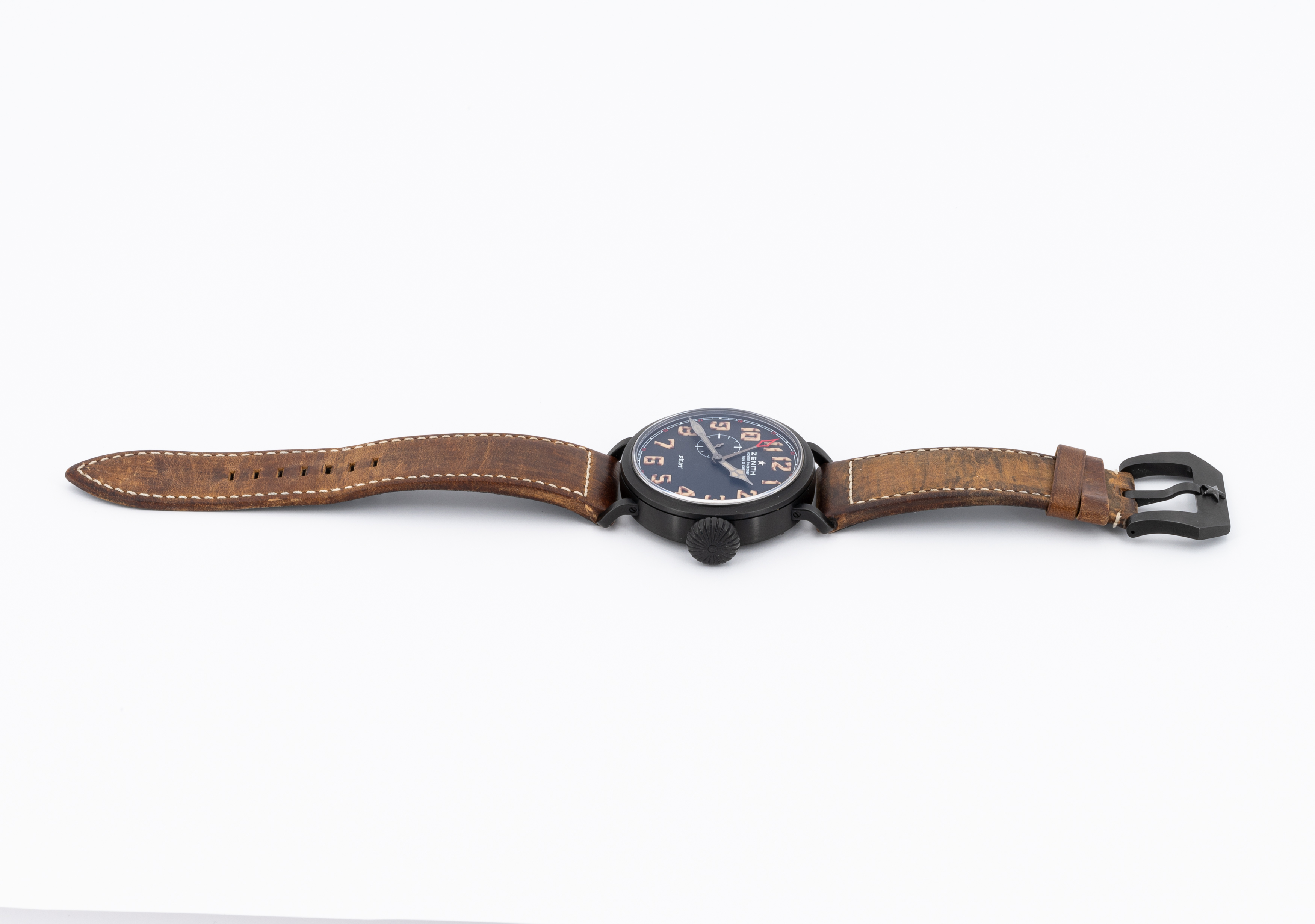 Gehäuse/Armband: Titan, Lederarmband mit Dornschließe, Zffbl. schwarz, arabische Ziffern cremefarben, Zeiger grau-silbern, Leuchtmasse.