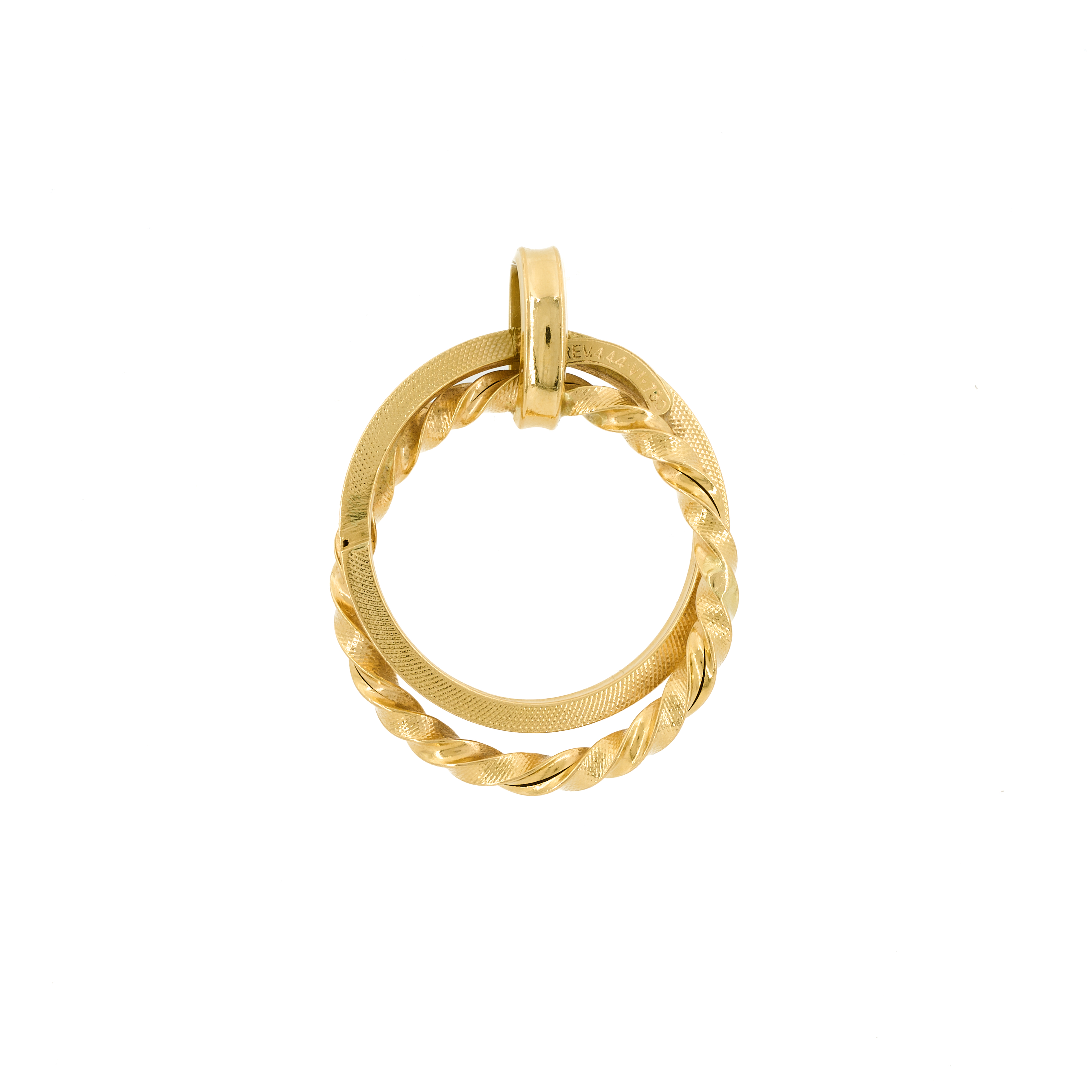 Traces of wear in the form of minor to medium scratches and small dents visible on the gold. Pendant warped, as a result of which the twisted ring has open joints in places. On the back of the other ring, 1 deep scratch and 1 pore as well as 1 open joint under the eyelet are visible.