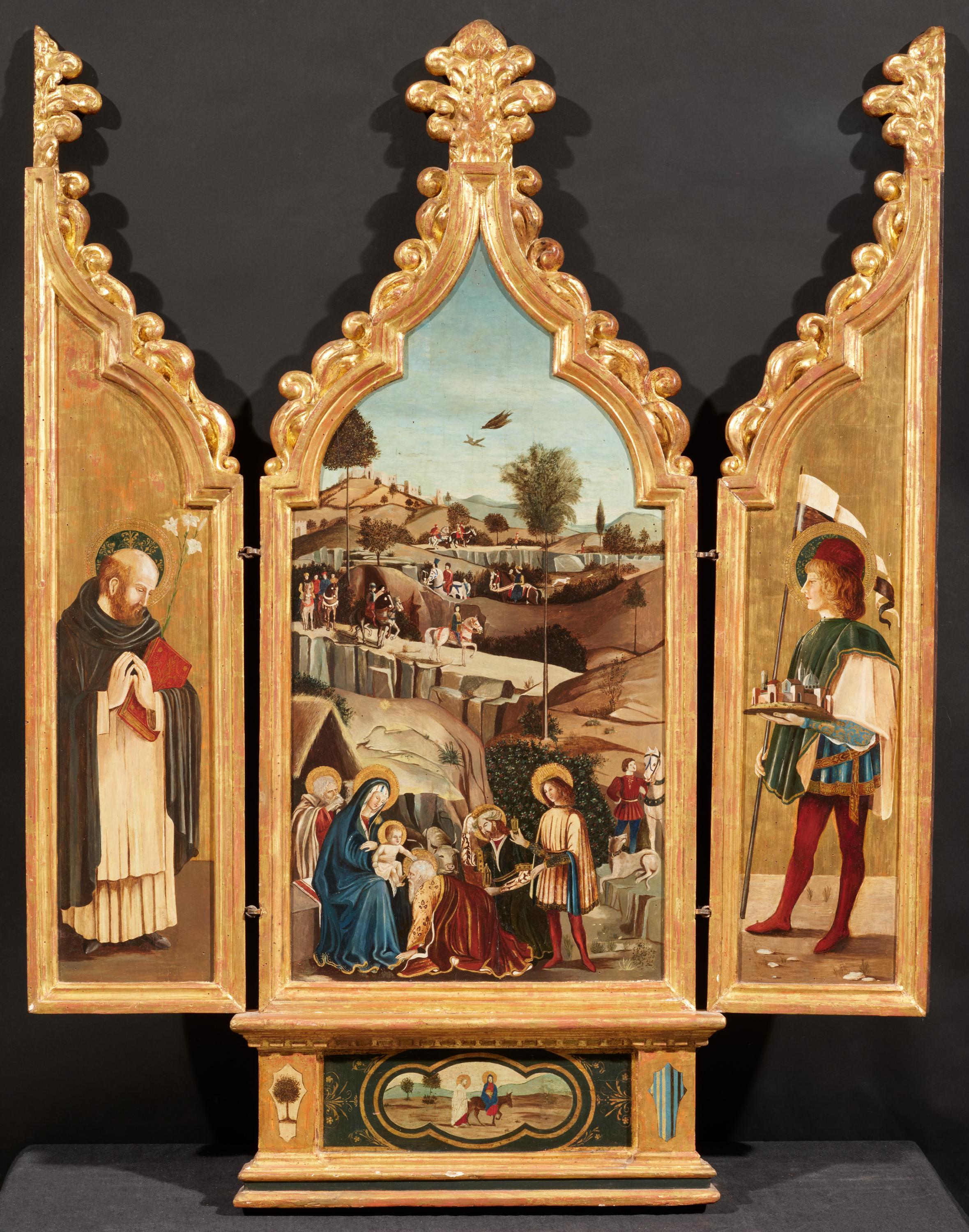 Subtitle: Central panel with the Adoration of the Magi, the wings with depictions of saints, on the predella the Flight into Egypt.