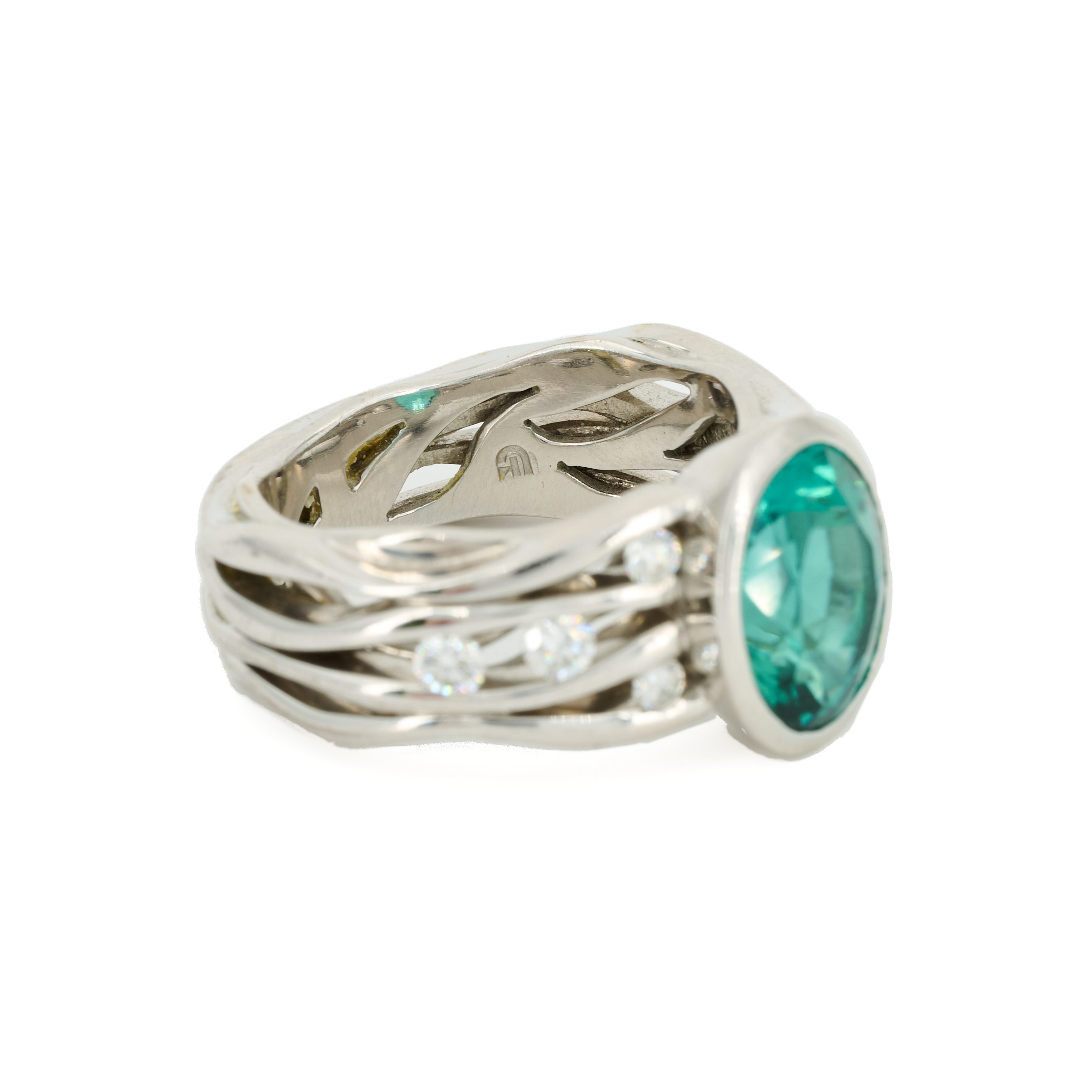 Description: White gold ring in the classic Devon wire mesh style, set with an oval tourmaline in a bezel setting and four embedded diamonds on each side. Jeweler's hallmark.