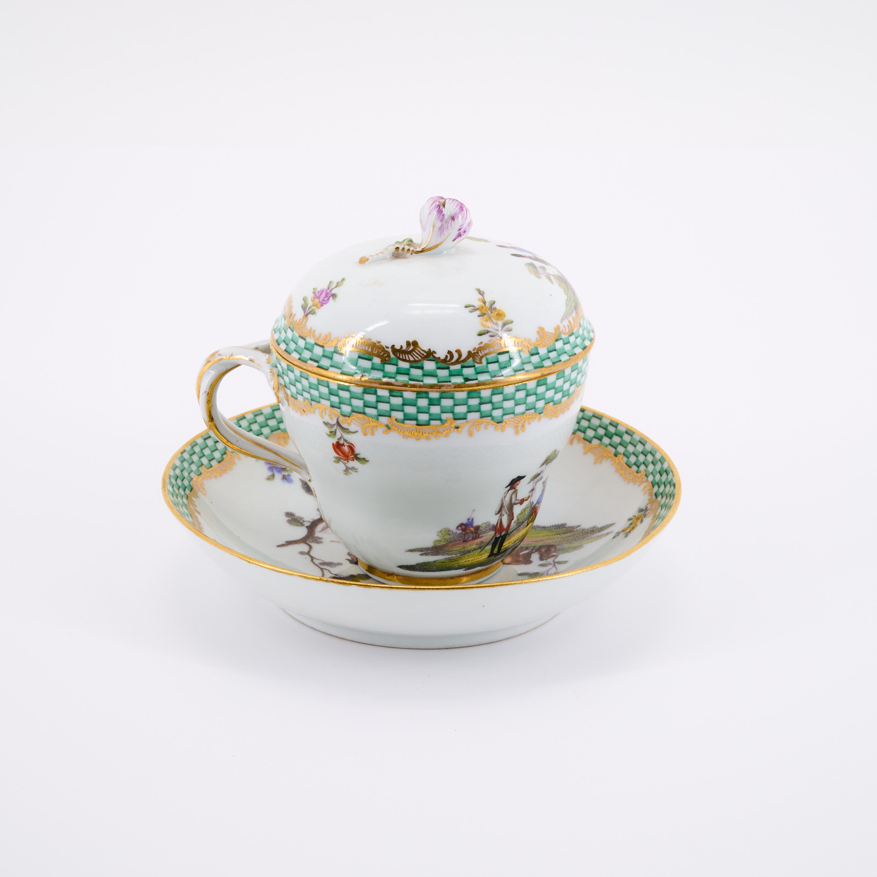 Title: Lidded cup and saucer with military scenes and turquoise green mosaic rim.