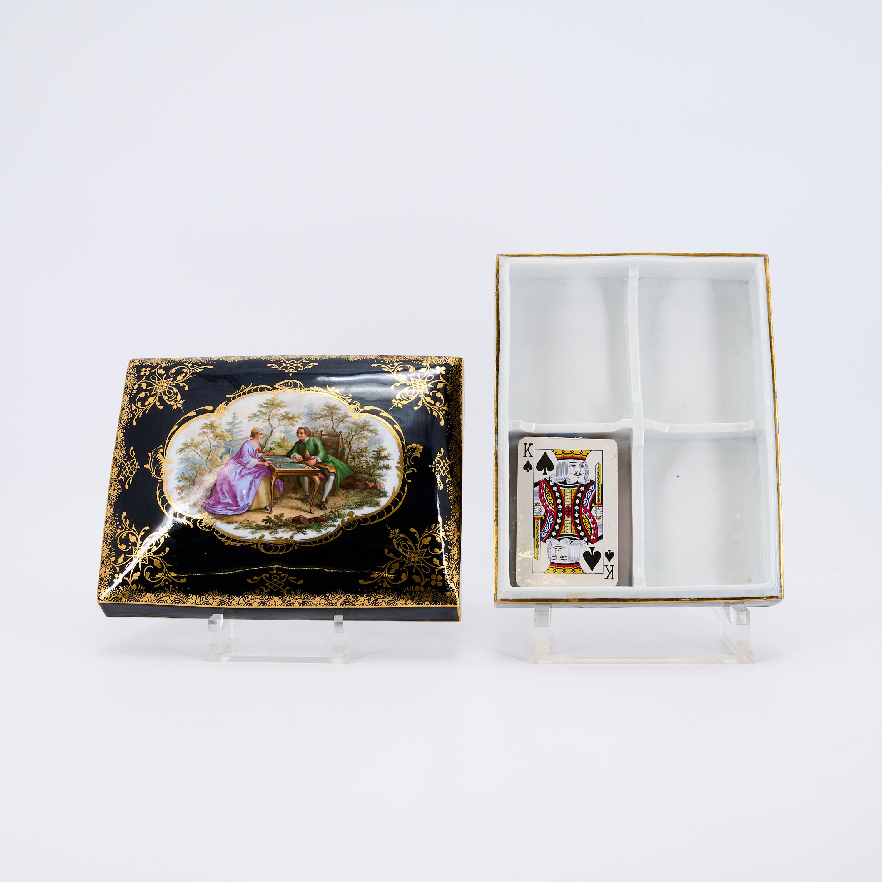 Rechteckige Form. Leicht gewölbter Deckel. In goldgerahmter Vierpassreserve Darstellung eines galanten Paares am Spieltisch. Reich dekoriert mit Goldspitzenbordüre und Vignetten. .