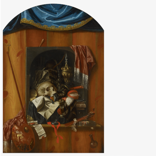 Trompe-l'oeil of a vanitas still life with clock and skull on a shelf on a wall, next to it painting utensils | Oil on canvas | 143 x 99cm