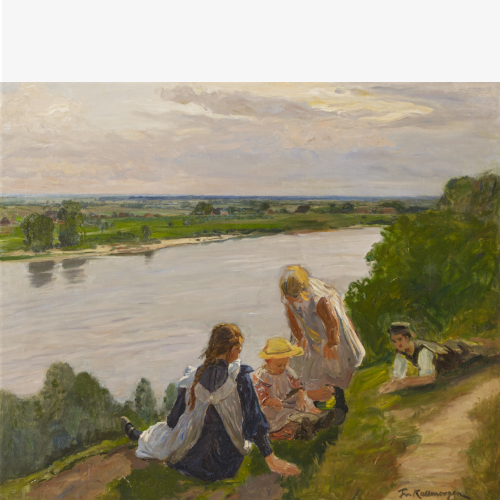 Group of children on the high bank of the Elbe near Lauenburg.